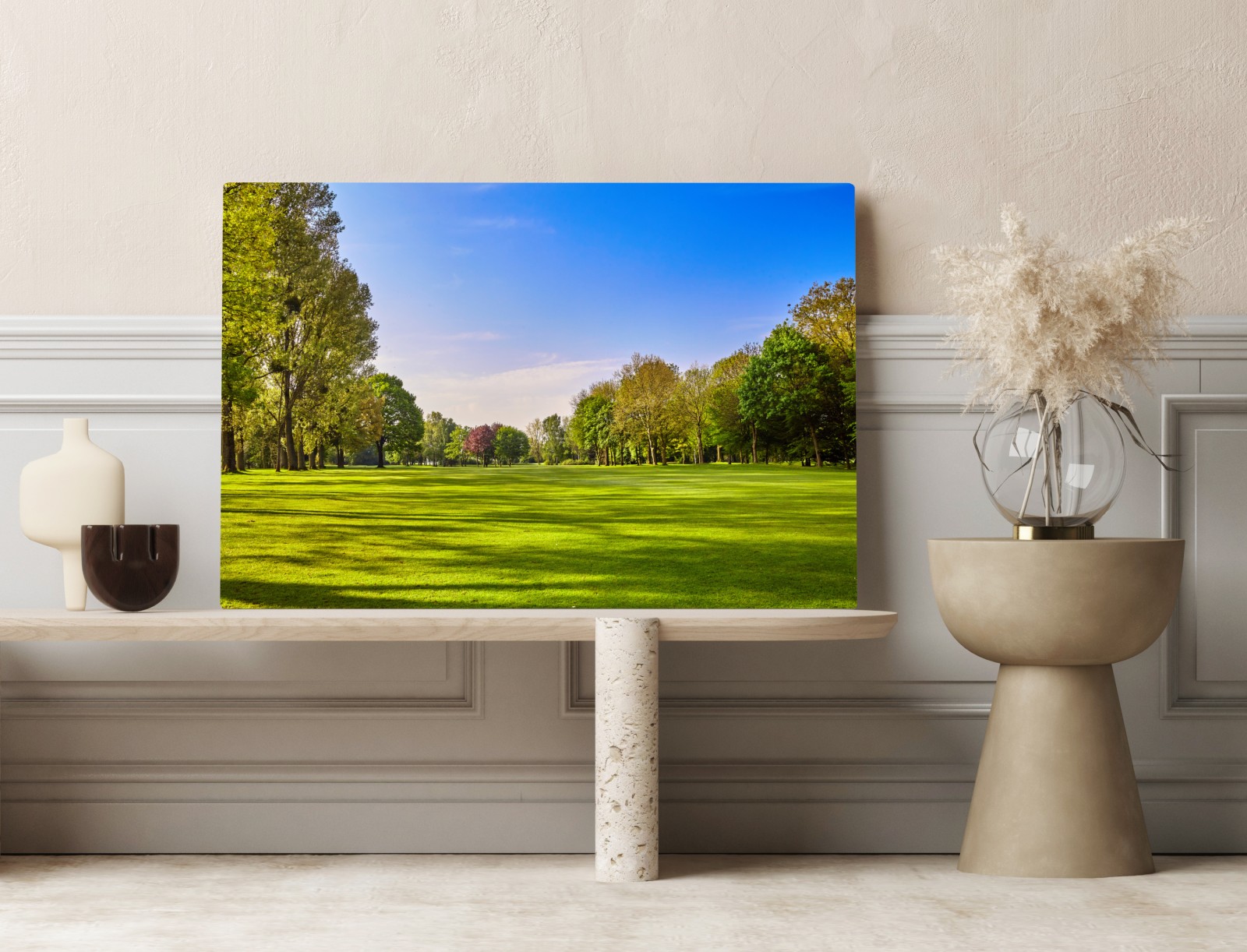 Hol dir die Ruhe eines sonnigen Stadtparks ins Zuhause mit diesem lebendigen Panoramabild, das jeden Raum mit natürlichen Farben erfüllt.