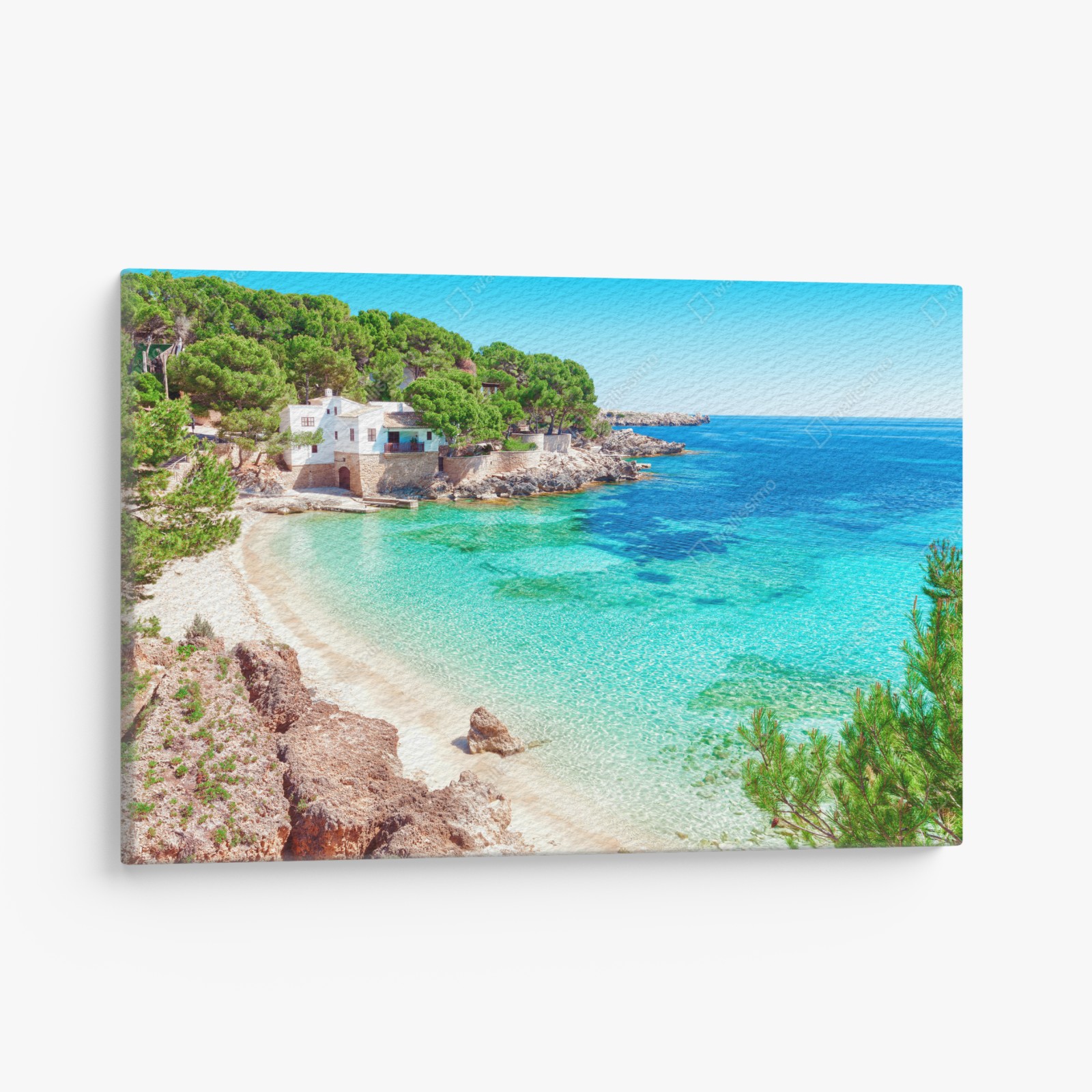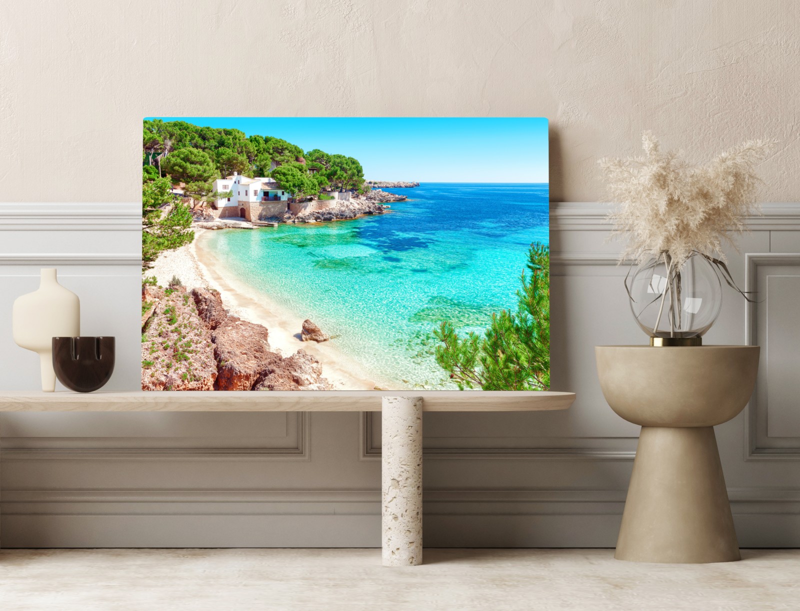 Bringen Sie Meeresruhe in Ihr Zuhause mit diesem lebendigen Blick auf eine versteckte Mittelmeerbucht, kristallklares türkisfarbenes Wasser und sonnenbeschienene Kiefern.