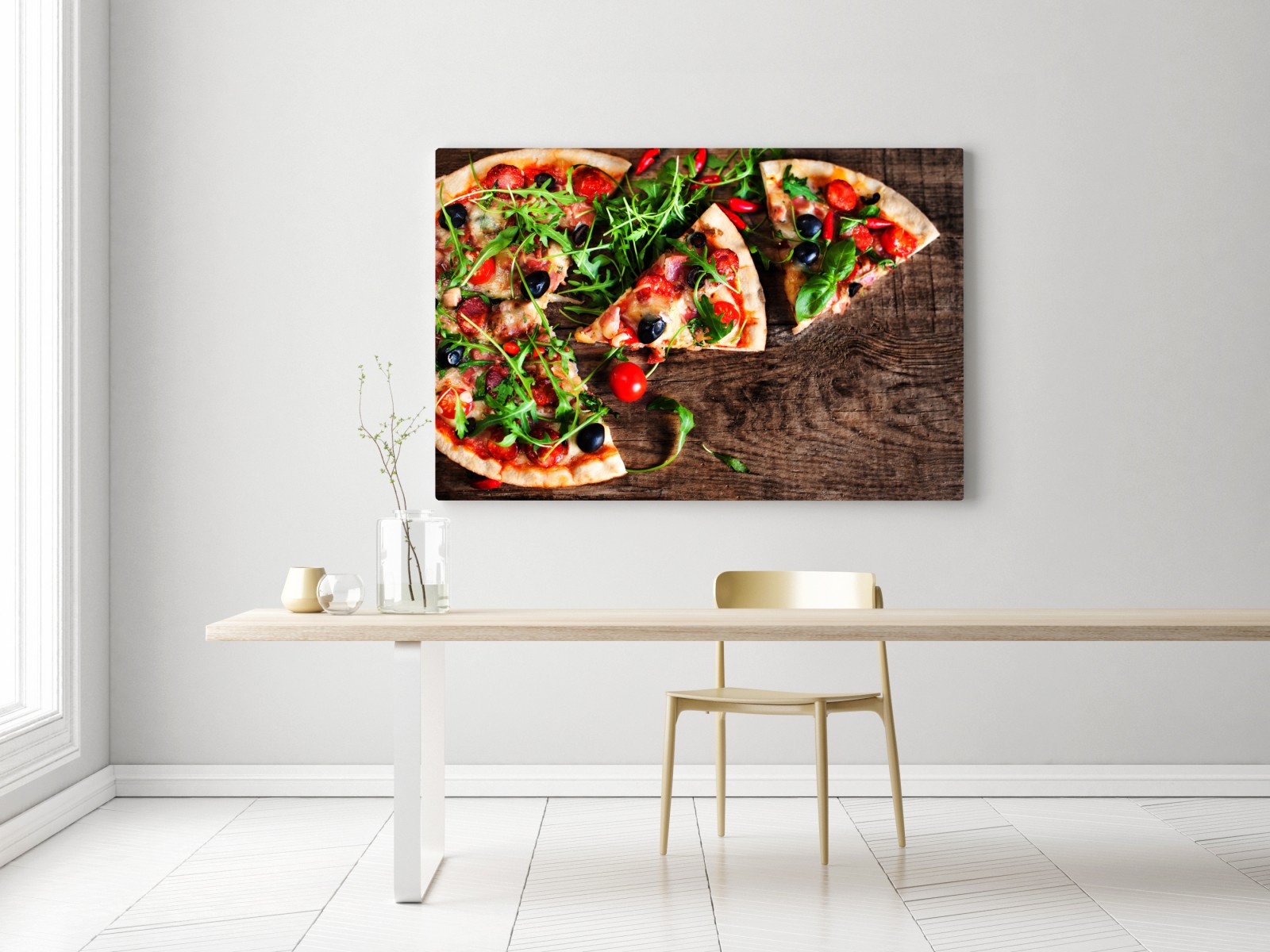 Lebendige Nahaufnahme einer heißen Pepperoni-Pizza mit geschmolzenem Käse und frischem Rucola auf rustikalem Holz; perfekte Wanddekoration für Küche und Esszimmer.