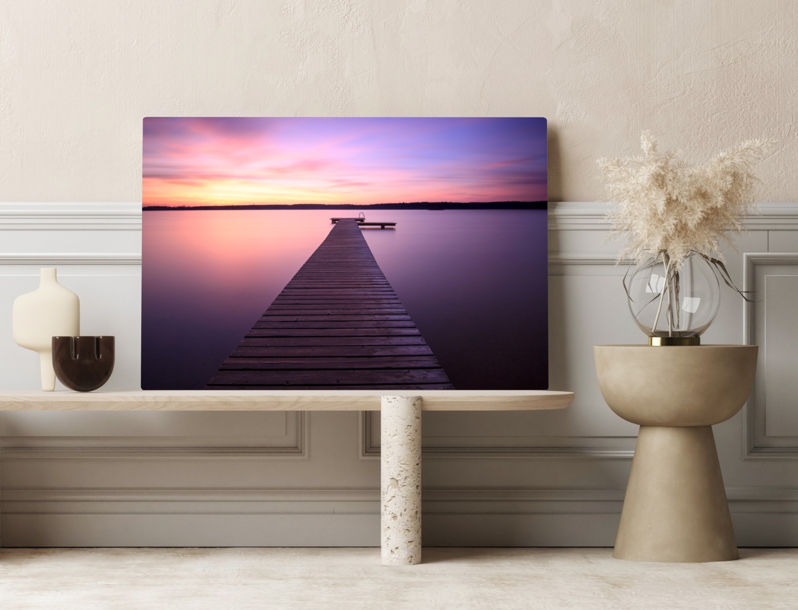 Ein ruhiger, pastellfarbener See bei Sonnenuntergang mit einem hölzernen Steg, ideal um eine entspannte Atmosphäre im Raum zu schaffen.