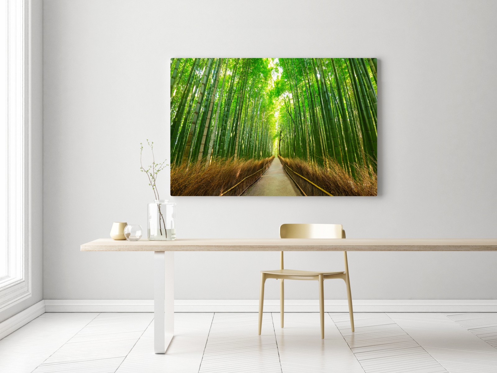 Bringen Sie die beruhigende Atmosphäre des Bambuswaldes von Arashiyama in Ihre Räume mit diesem lebendigen, grünen Motiv voller vertikaler Linien und Natur.