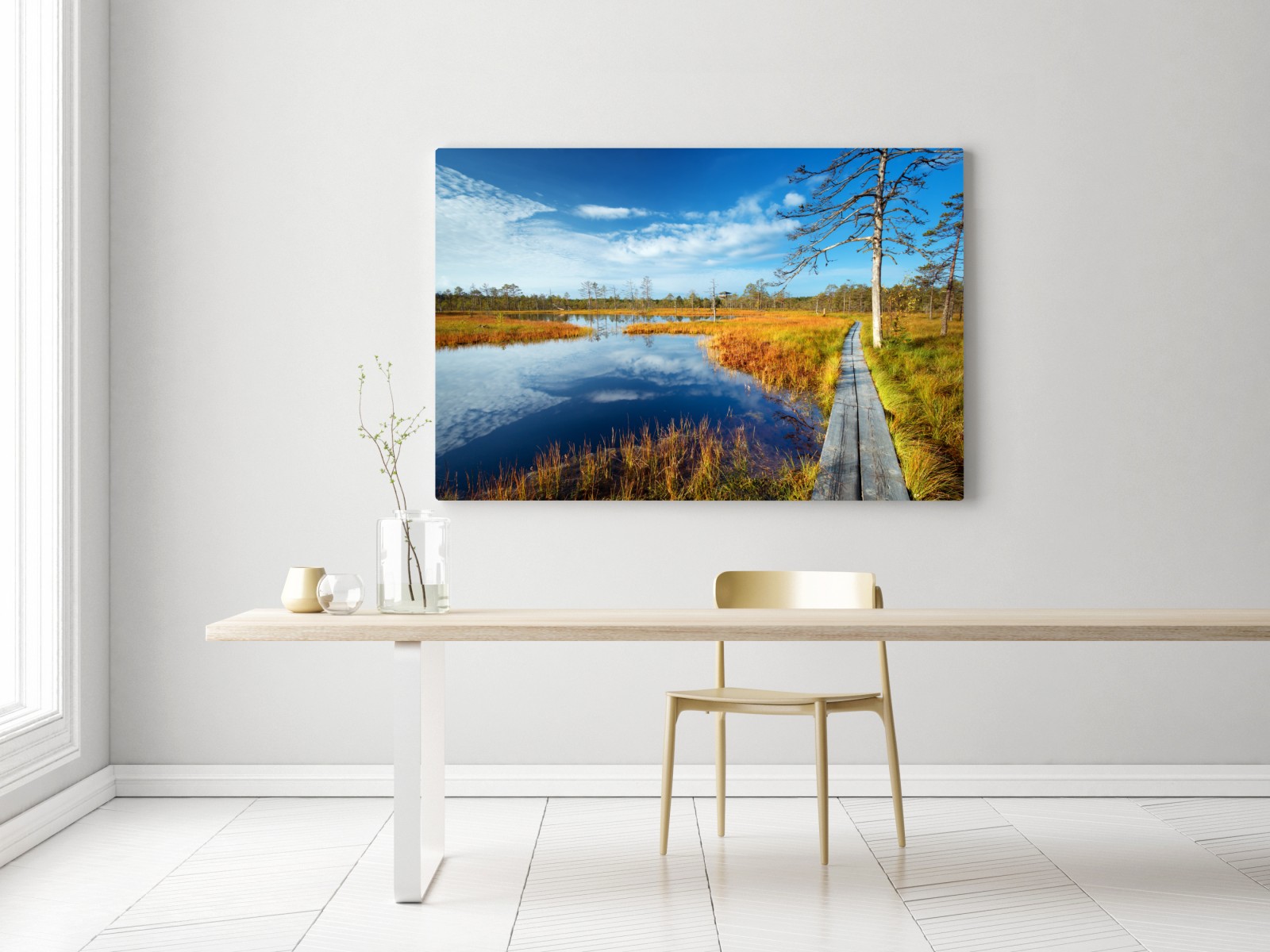 Ein ruhiges landschaftsbild mit einem hölzernen Steg über einem spiegelnden Moor und klarem blauem Himmel, ideal um Natur und Ruhe ins Zuhause zu bringen.