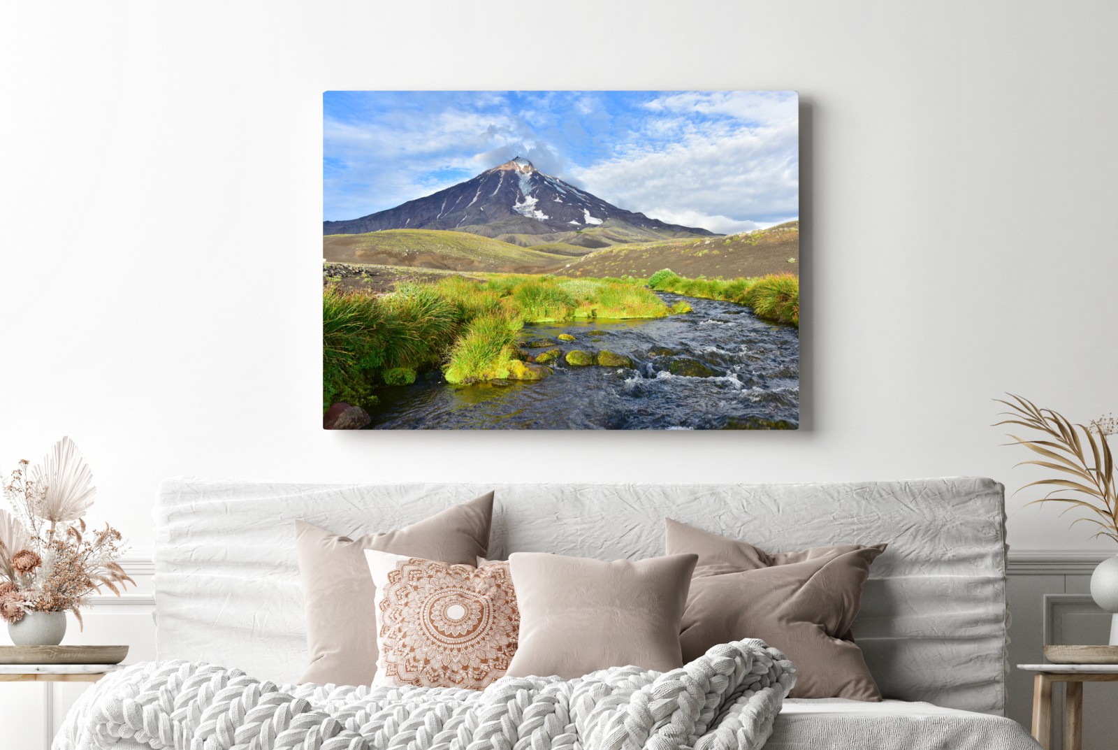 Majestätischer Blick auf den Vulkan Koryaksky mit fließendem Fluss und grüner Tundra, ideal um natürliche Ruhe ins Zuhause zu bringen.