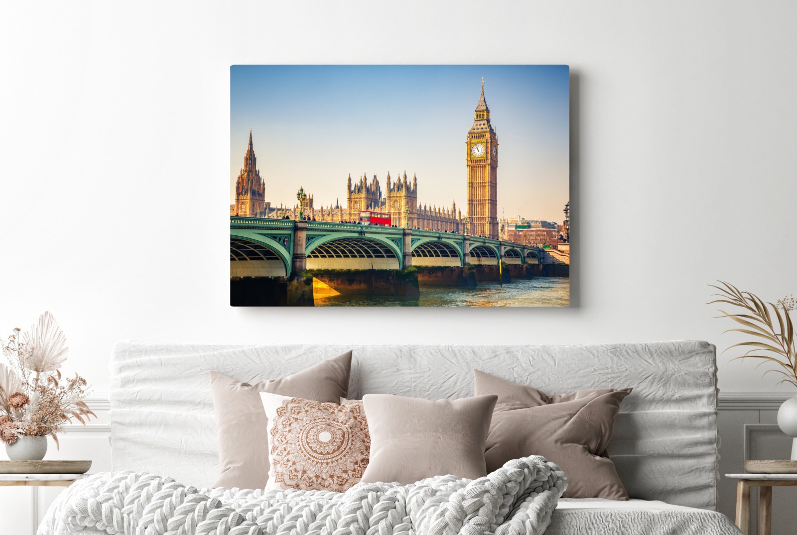 Warmes sonniges Foto von Big Ben und der Westminster Bridge über der Themse, ideal um ikonischen London-Charme an Ihre Wände zu bringen.