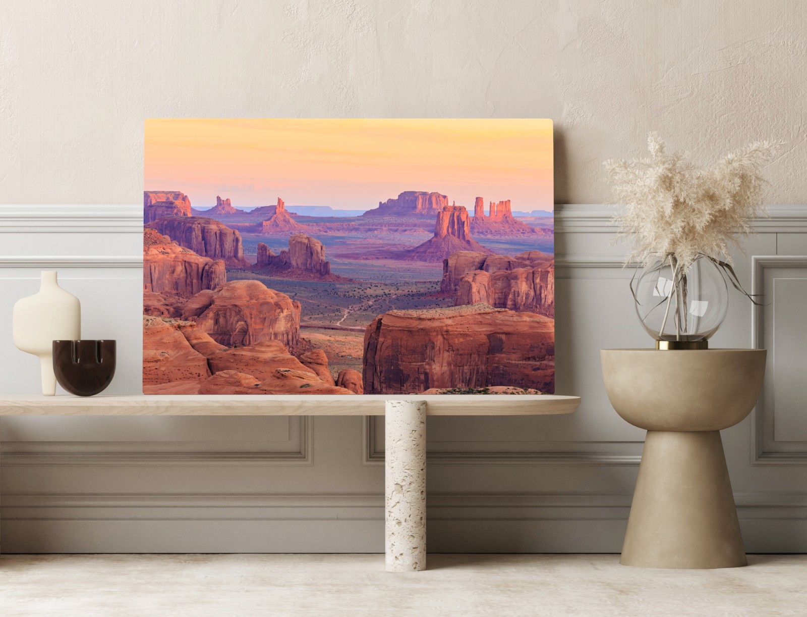 Atemberaubende Panoramaaufnahme von Monument Valley bei Sonnenuntergang, die ikonische Sandsteinformationen und warme Wüstentöne zeigt und Ihrem Raum natürliche Ruhe und Weite verleiht.