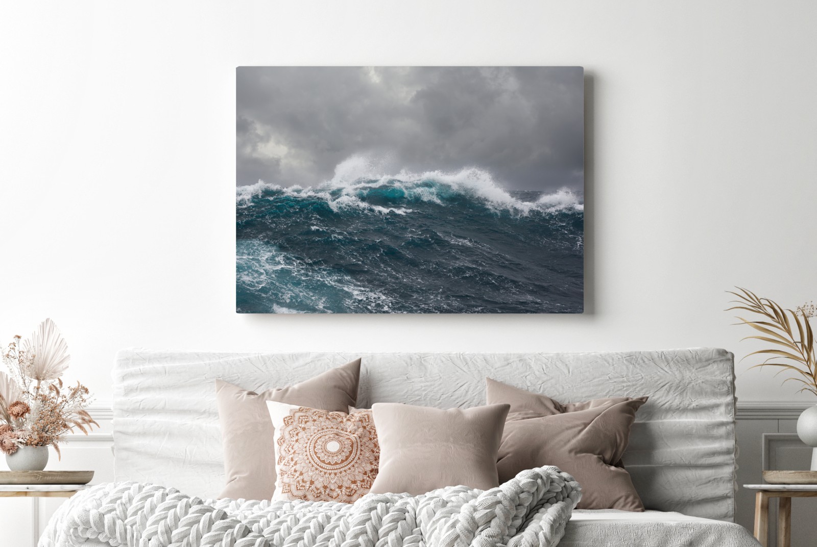 Eine dramatische Meereslandschaft, die die rohe Kraft des Ozeans unter stürmischem Himmel zeigt und jedem Raum Stimmung und Dynamik verleiht.