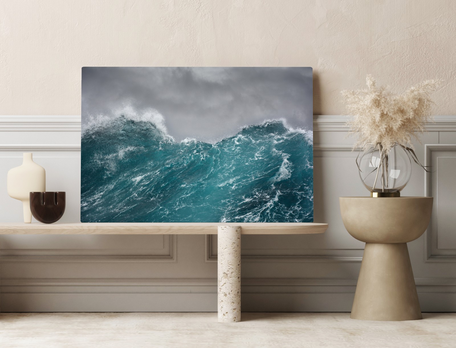 Dramatische Meeresaufnahme mit kraftvollen türkisfarbenen Wellen unter einem stürmischen Himmel. Ideal, um natürliche Dynamik und Ruhe in Ihr Interieur zu bringen.