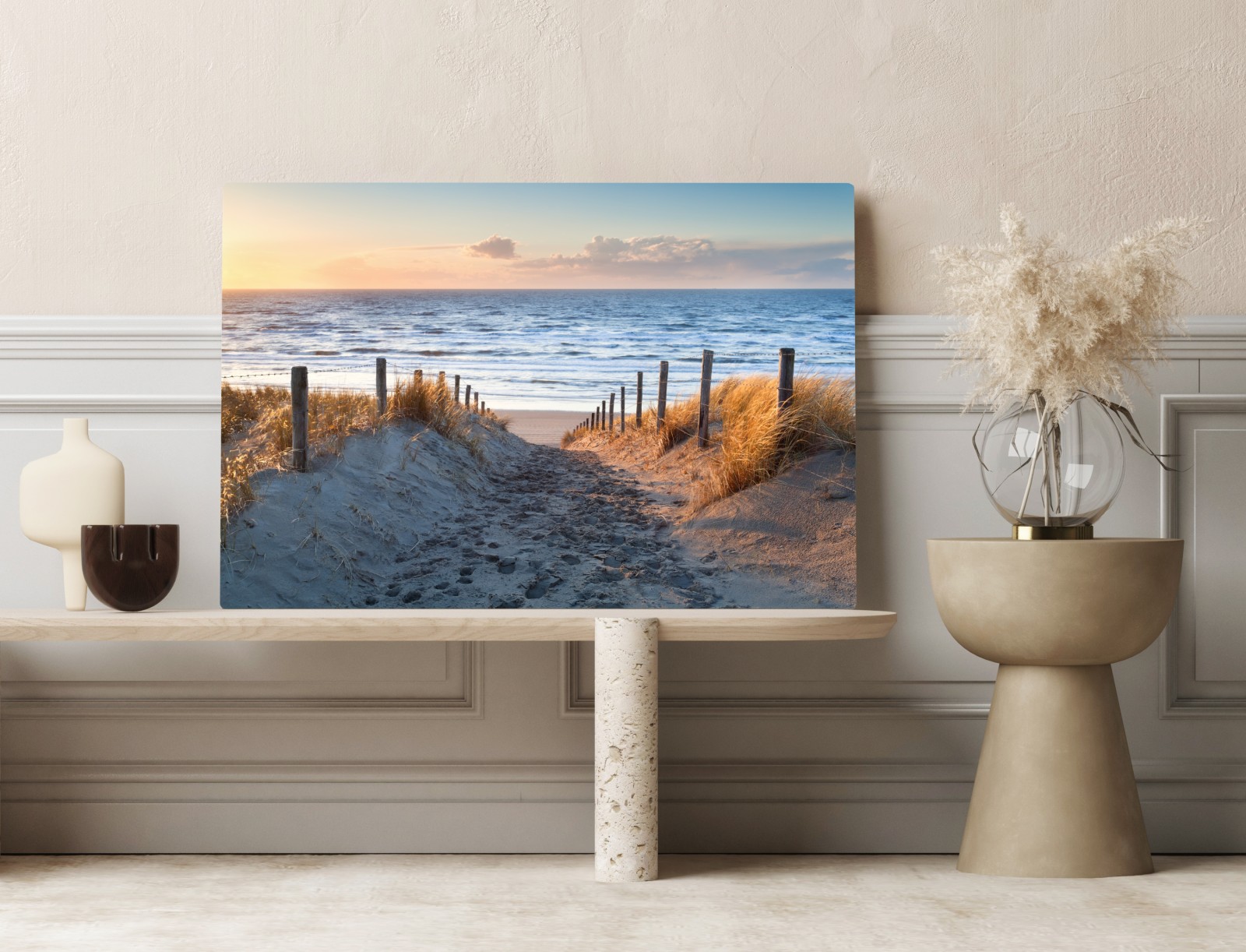 Ein ruhiger Sonnenuntergang über einem sandigen Pfad zur Nordsee in Holland, ideal um eine maritime Atmosphäre ins Zuhause zu bringen.