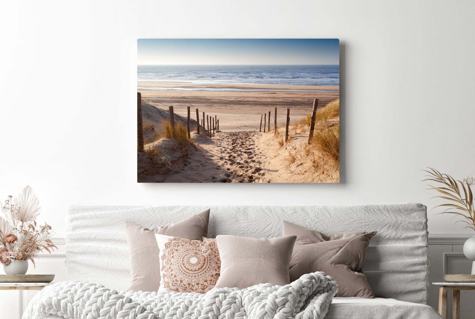 Ein ruhiger Sandweg führt durch die Dünen zur glitzernden Nordsee bei Sonnenuntergang und bringt maritimes Flair in Ihr Zuhause.
