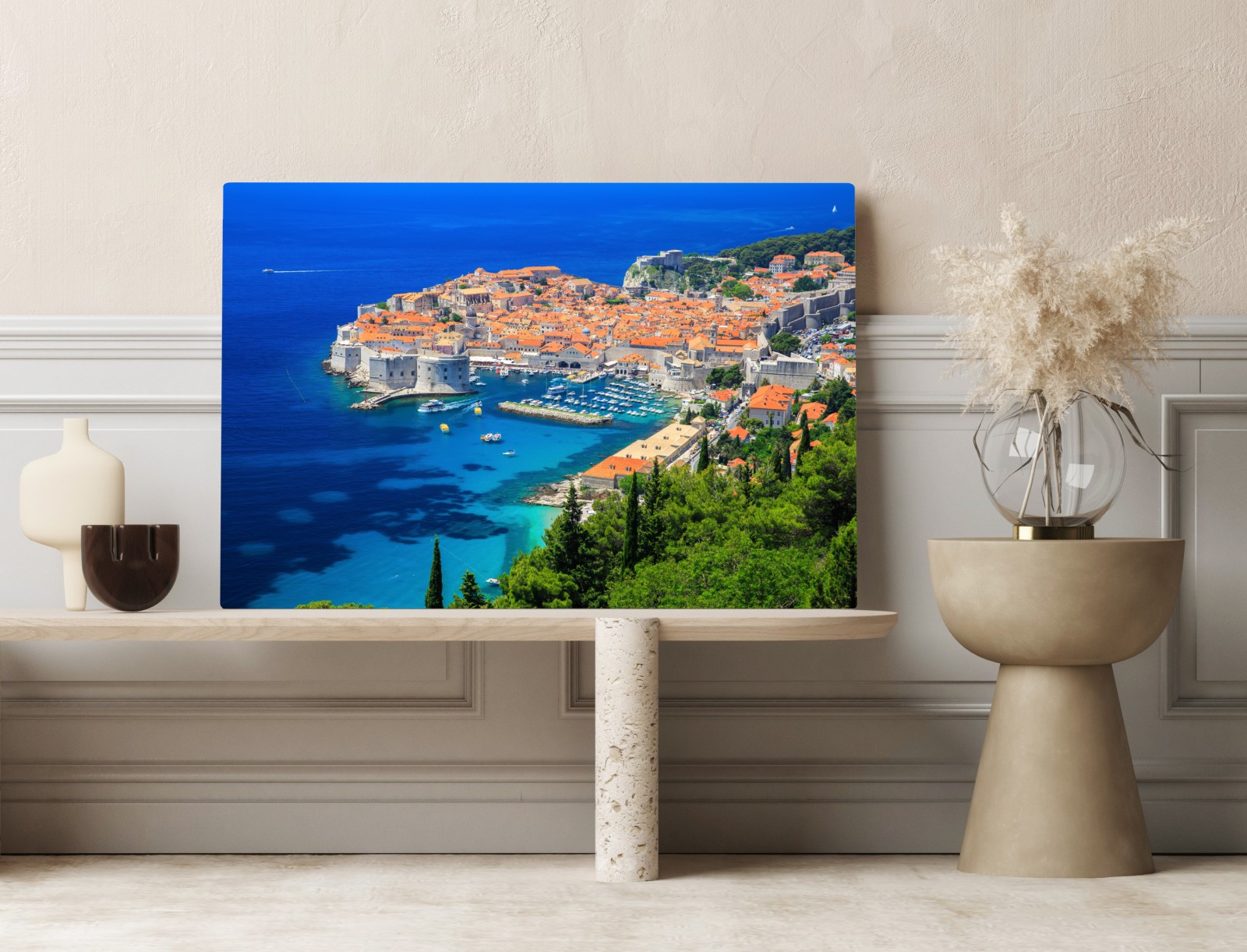 Lebendige Luftaufnahme der historischen Altstadt von Dubrovnik und des türkisfarbenen Adriawassers, die mediterranes Flair an jede Wand bringt.