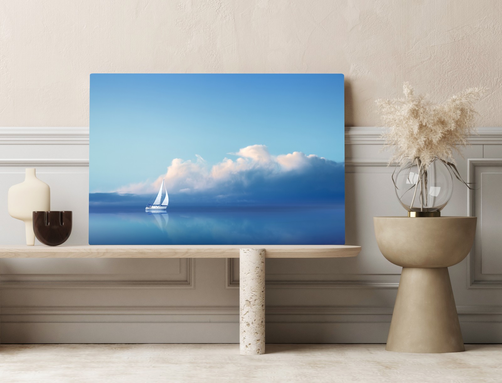 Ein ruhiges Segelboot gleitet über ein spiegelglattes blaues Meer unter weichen Wolken und schafft eine entspannte maritime Atmosphäre im Raum.
