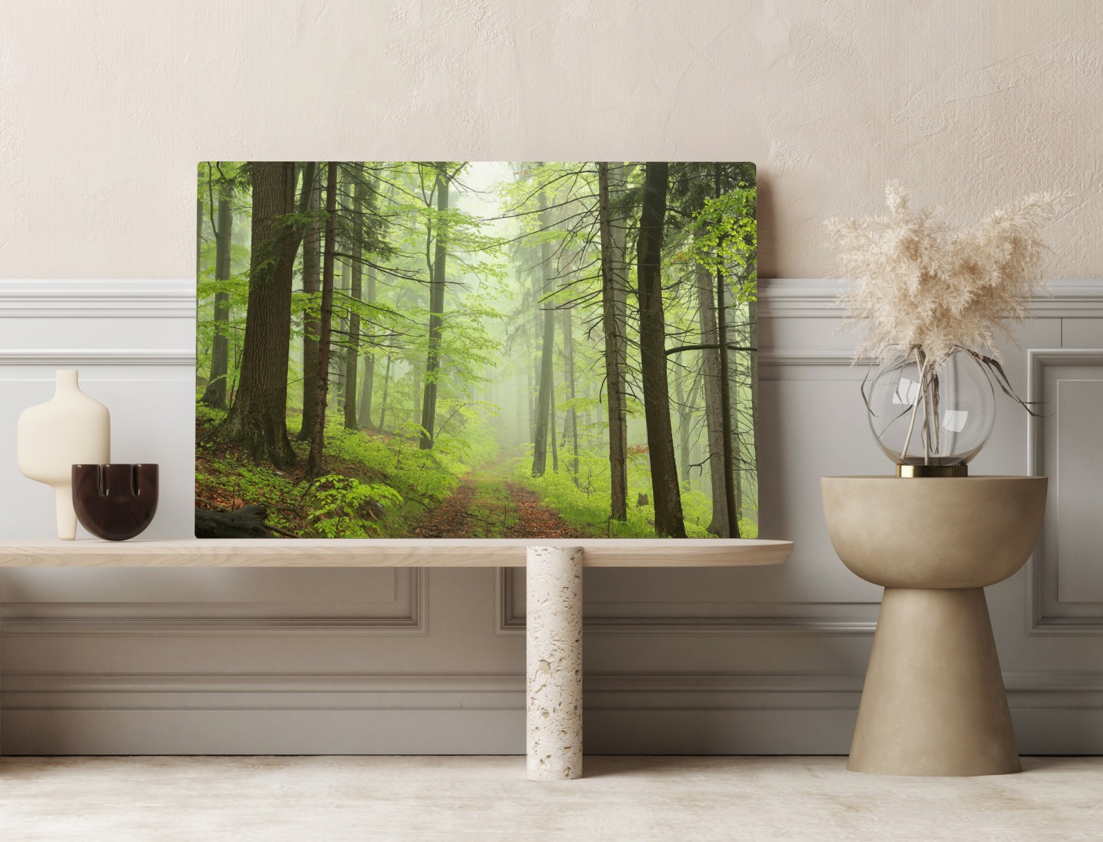 Eine ruhige neblige Waldszene, die natürliche Schönheit und Entspannung in jeden Raum bringt.