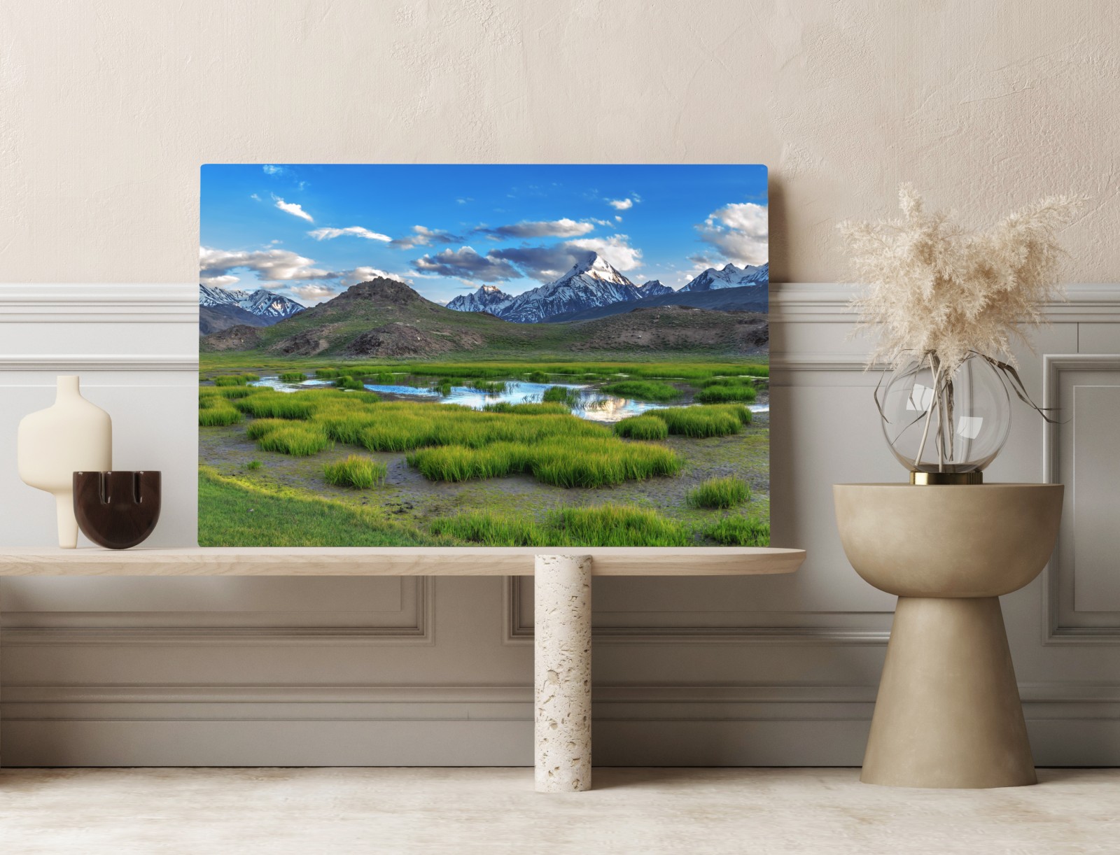 bringt ruhe ins zuhause mit einem stillen bergsee im Himalaya vor schneebedeckten gipfeln und grünen wiesen, ideal für naturnahe dekoration.