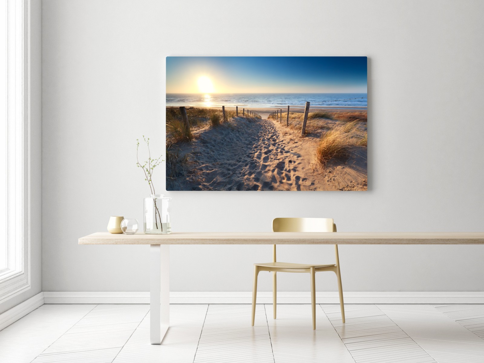 Ruhige Küstenlandschaft mit einem sandigen Pfad durch Dünen zum Nordseeufer, warmes Licht und beruhigende Farben für jede Einrichtung.