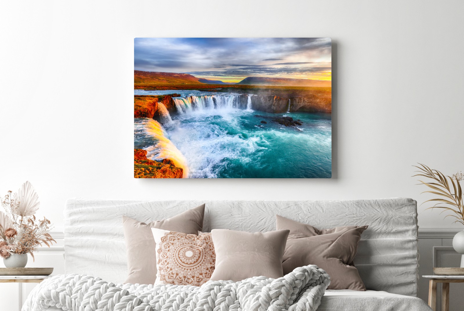 Atemberaubender Sonnenaufgang über Godafoss mit türkisblauem Wasser und dramatischem Himmel, der einen kraftvollen Blickfang für jeden Raum schafft.