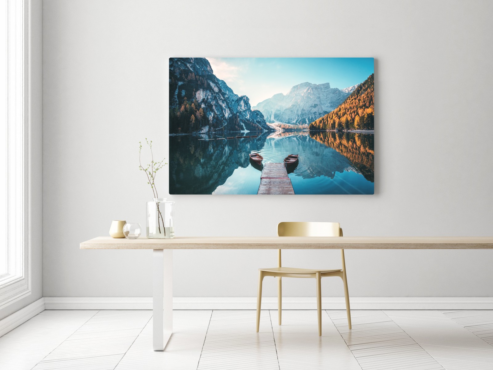 Bringen Sie Ruhe und natürliche Schönheit in Ihr Zuhause mit diesem Panorama vom Pragser Wildsee und den rustikalen Booten, die sich im glatten Wasser spiegeln.