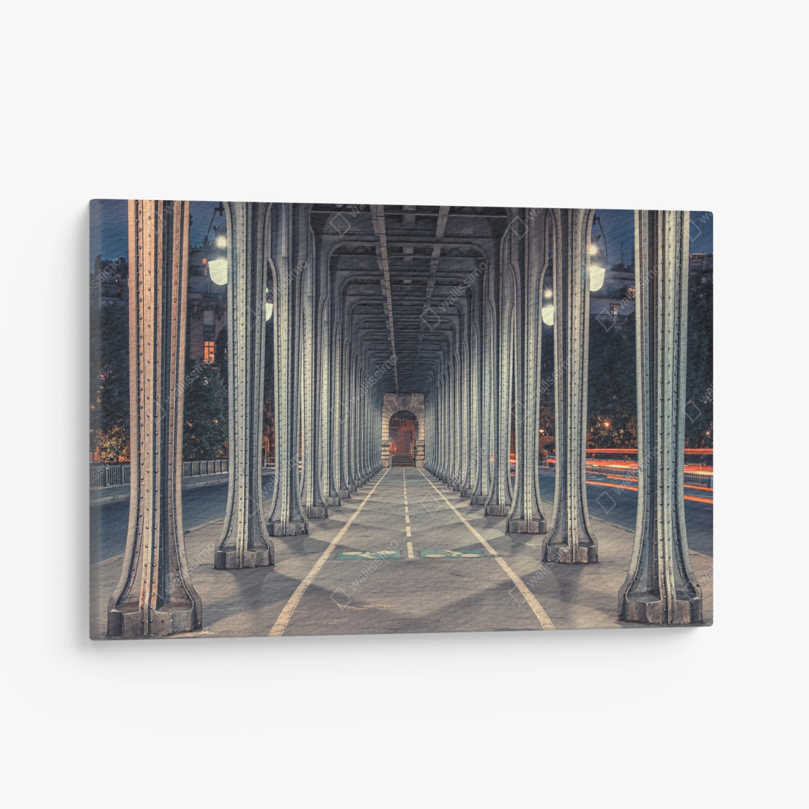 Leinwandbild Symmetrischer stahlkorridor einer brücke bei nacht