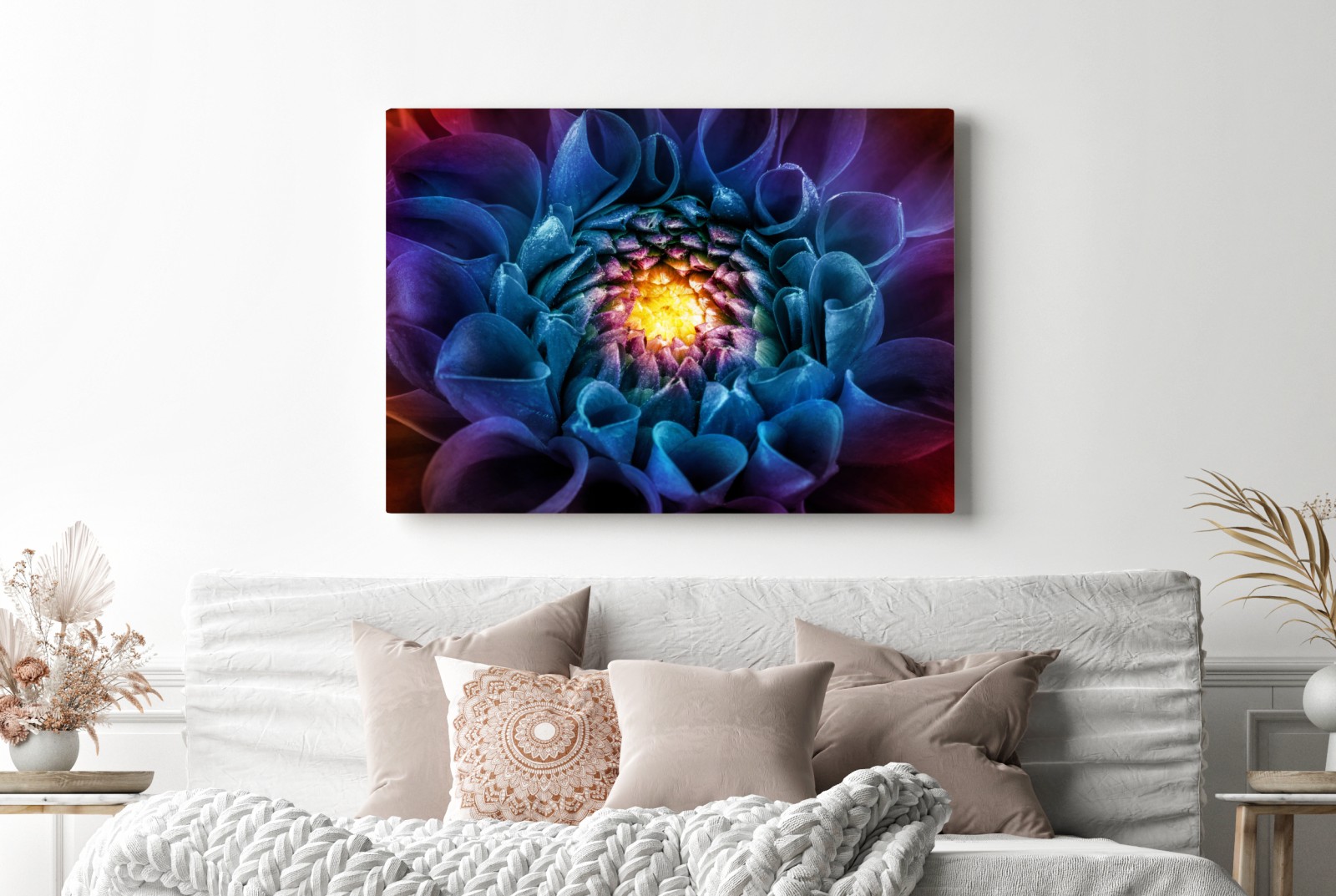 Beeindruckende Makroaufnahme einer bunten Chrysantheme mit tiefen Blautönen und strahlendem Gelb, ideal zur Belebung von Wohnräumen.