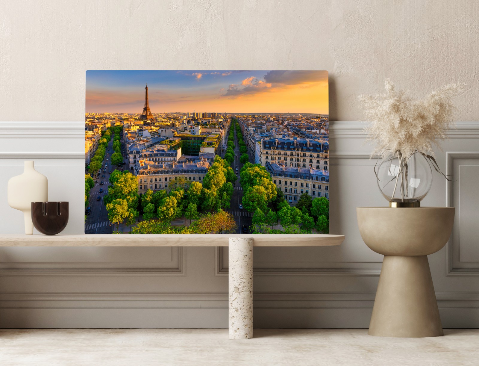 Lebhafte Panoramaaufnahme von Paris bei Sonnenuntergang mit dem Eiffelturm und baumgesäumten Alleen, perfekt, um Räumen urbane Eleganz zu verleihen.