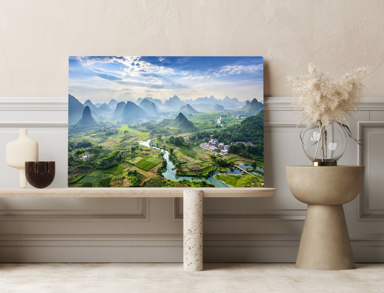 Ein ruhiges Panorama mit nebligen Karstgipfeln, mäandrierenden Flüssen und grünen Feldern, das natürliche Harmonie in jeden Raum bringt.