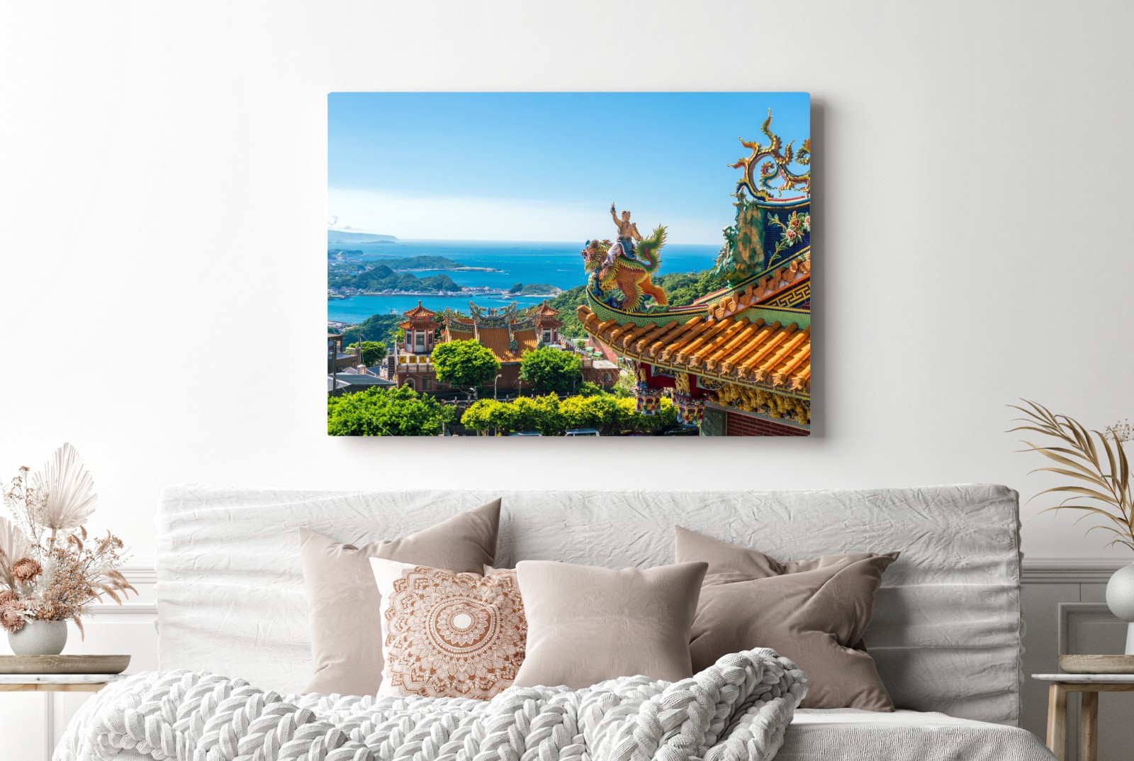 Leinwandbild tempel mit blick auf die küste von Jiufen, Taiwan