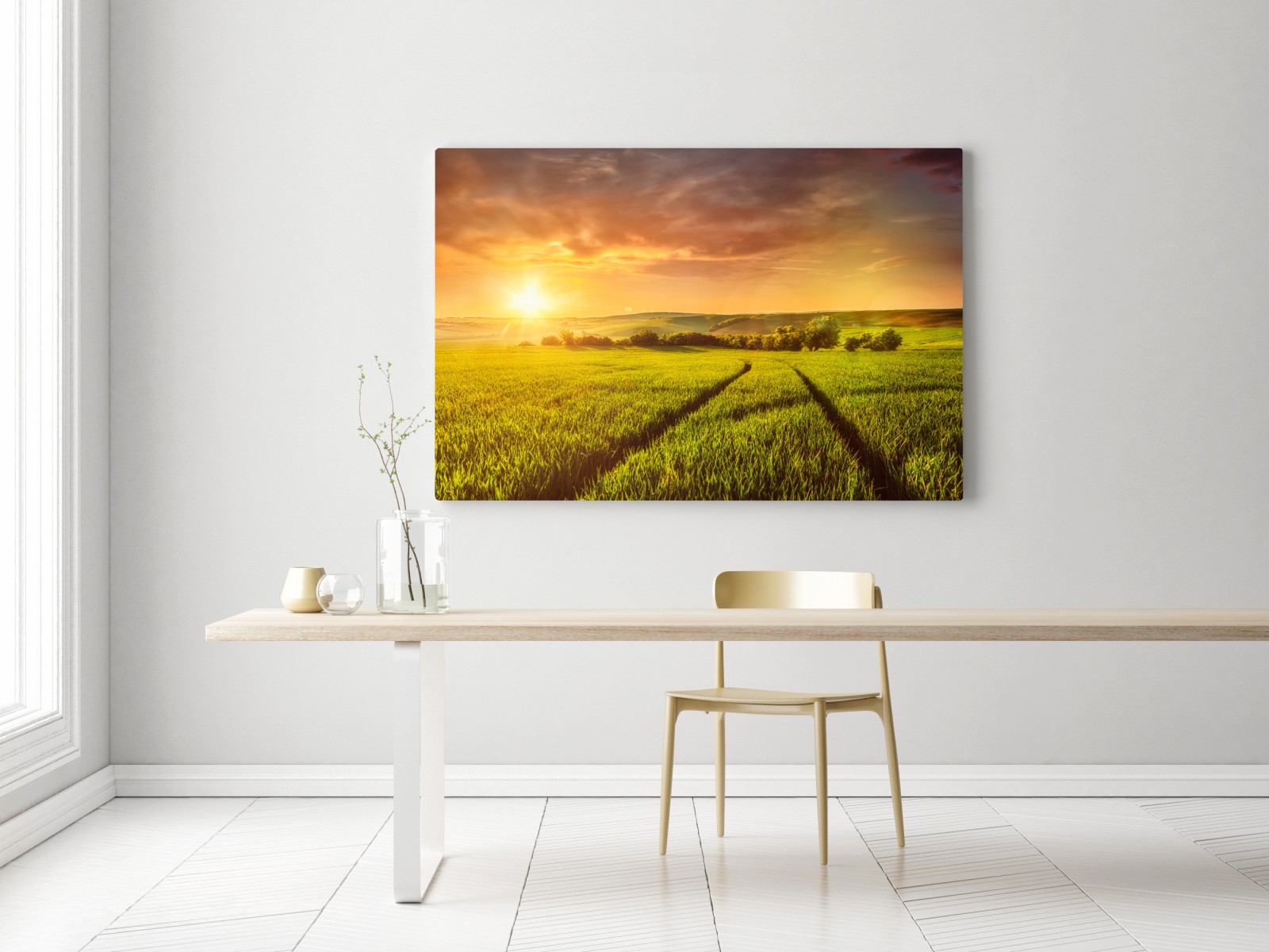 Bringen Sie Wärme und Ruhe in Ihr Zuhause mit dieser idyllischen Wiese im warmen Abendlicht.