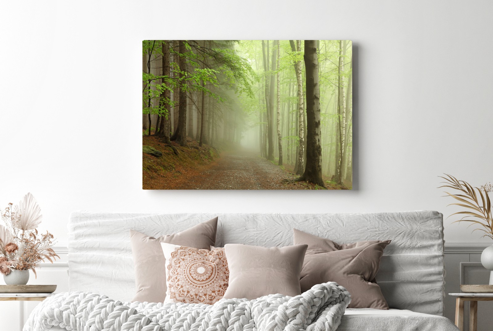 verleihen sie ihrem raum eine ruhige atmosphäre mit diesem nebligen waldpfad, der üppiges grünes laub, schlanke birkenstämme und sanften morgennebel zeigt.