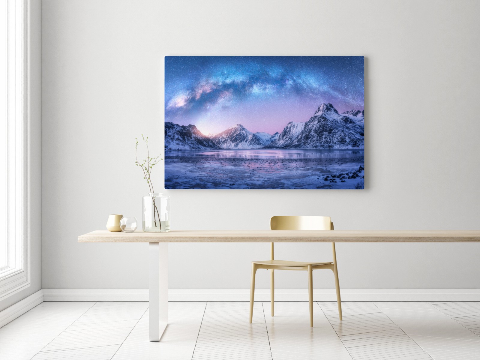 Panoramablick auf verschneite Berge, die sich in einem ruhigen See spiegeln, unter einem leuchtenden Milchstraßenhimmel — verleiht jedem Raum Ruhe und Faszination.