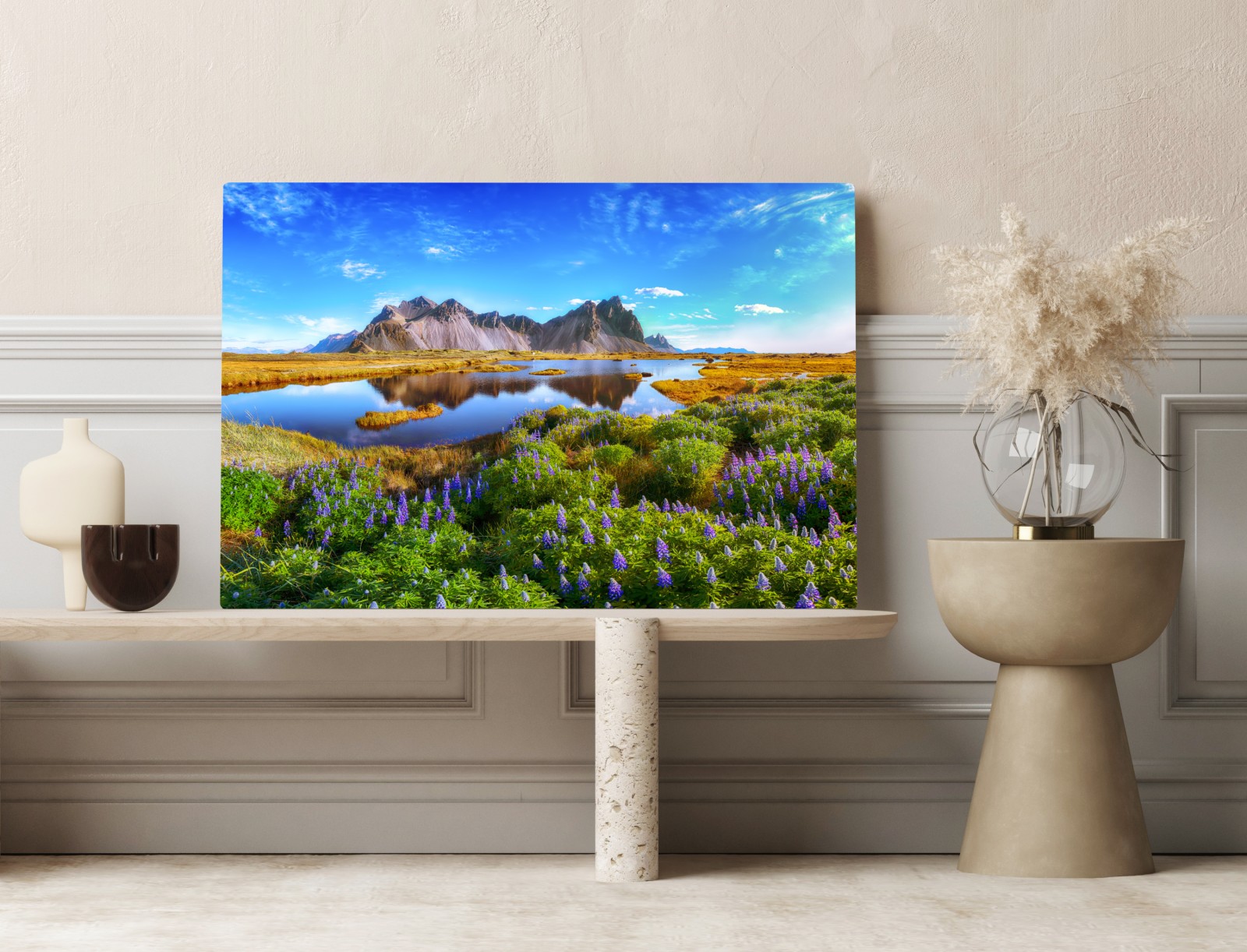 Leinwandbild lupinenwiese am Vestrahorn, Island – Wallnifity®