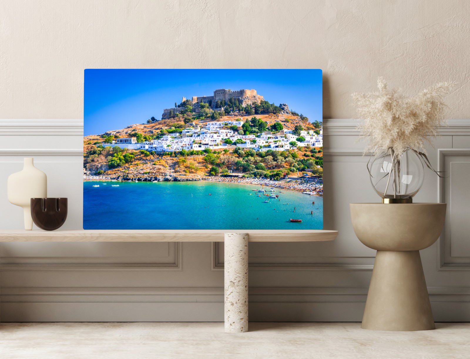 Helles mediterranes Küstenbild mit der Akropolis von Lindos über weiß getünchten Häusern und türkisblauem Wasser, ideal um Urlaubsstimmung ins Zuhause zu bringen.