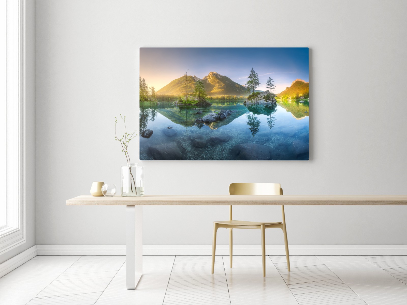 Leinwandbild alpensee bei sonnenaufgang mit spiegelnder reflexion