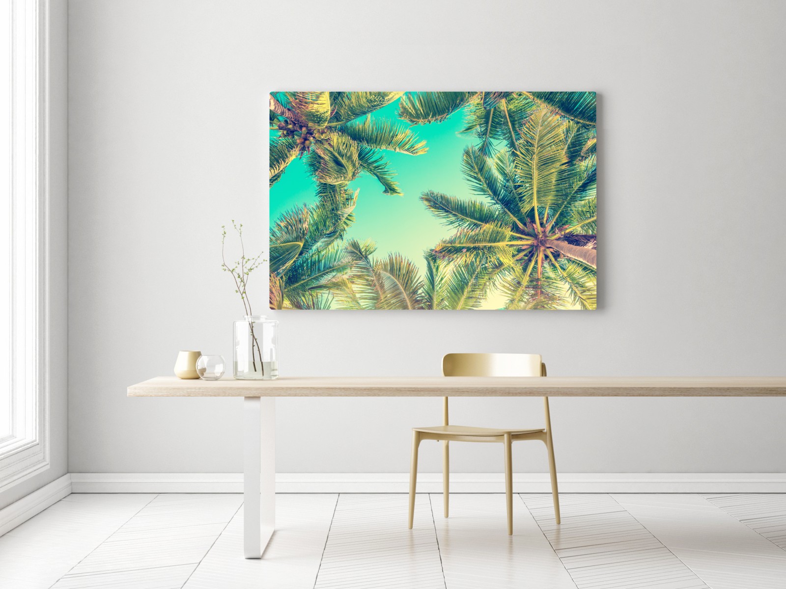 Bringen Sie tropisches Sommerflair in Ihr Zuhause mit einer retro-ansicht von Palmen vor einem türkisfarbenen Himmel.