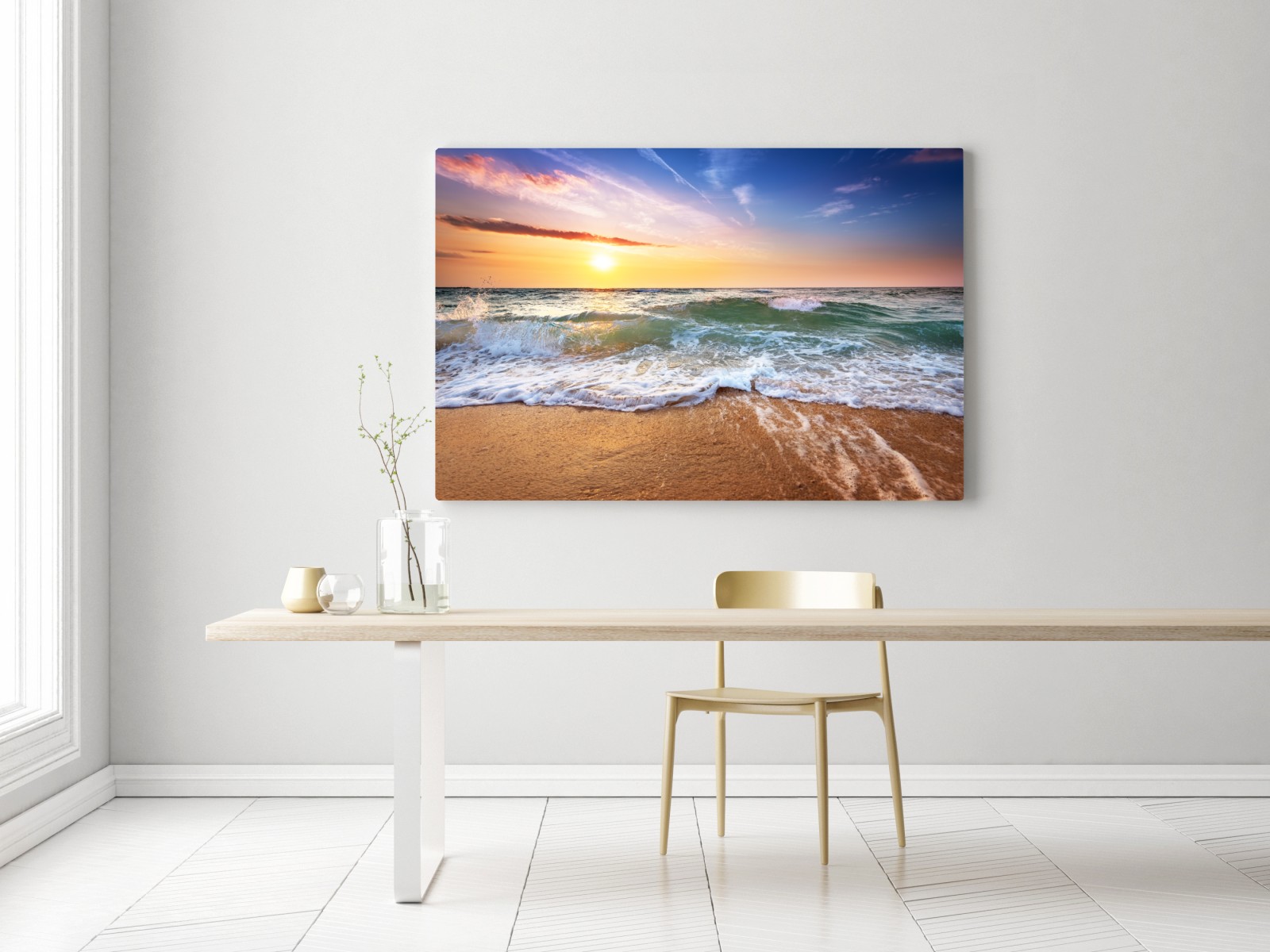 Leinwandbild goldener sonnenuntergang am strand mit sanften wellen
