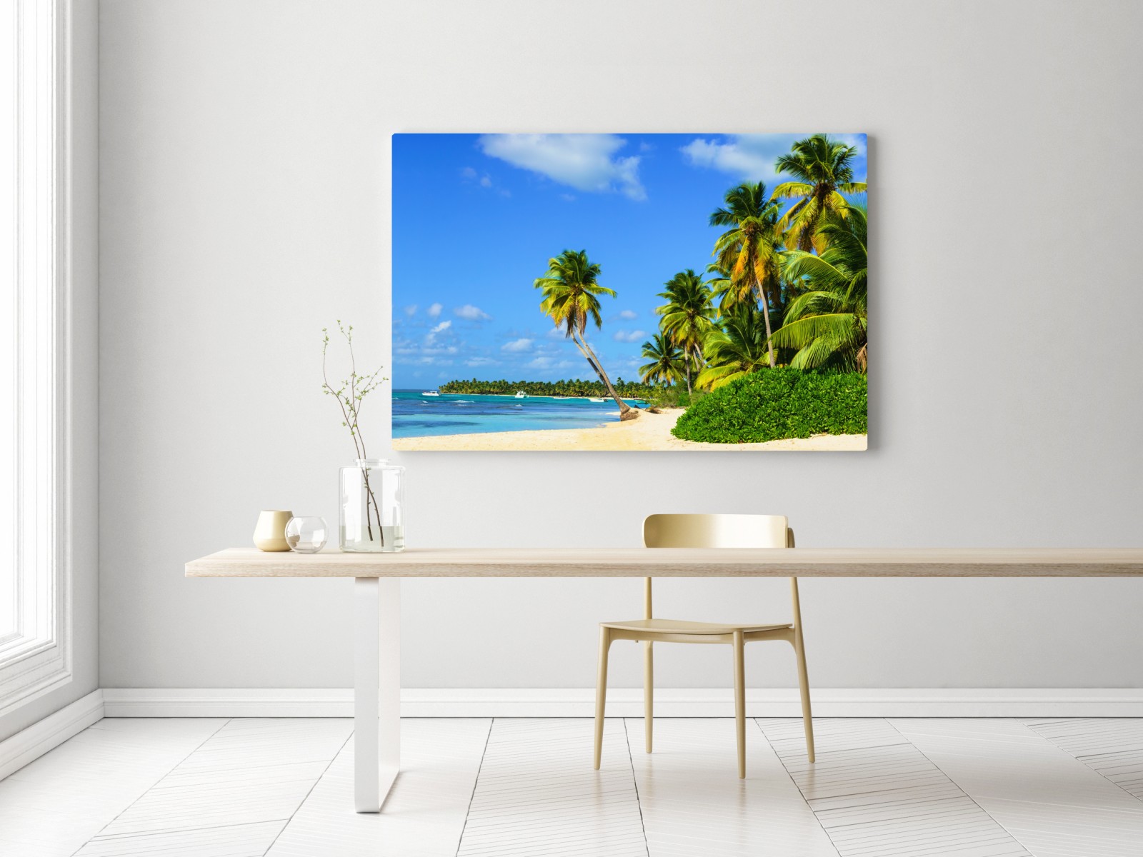 Bringen Sie tropisches Flair in Ihr Zuhause mit dieser lebendigen Strandaufnahme mit wiegenden Palmen, türkisfarbenem Wasser und goldenem Sand.