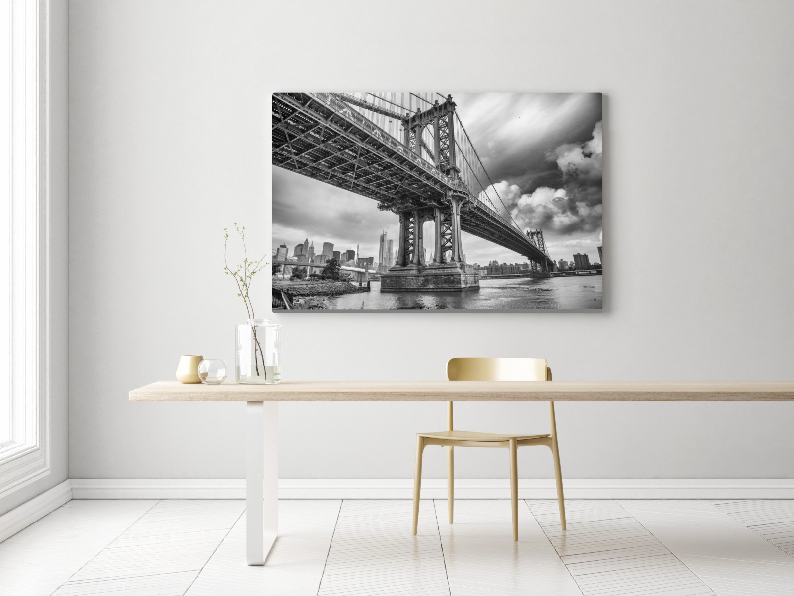 Dramatisches schwarzweißbild der Manhattan Bridge bringt industriellen, urbanen Charakter und Tiefe in jeden Raum.