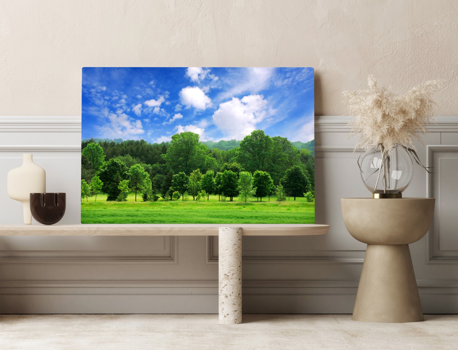 Lebendiges Sommerpanorama mit üppig grünen Bäumen und strahlend blauem Himmel, das natürliche Ruhe in Ihren Raum bringt.