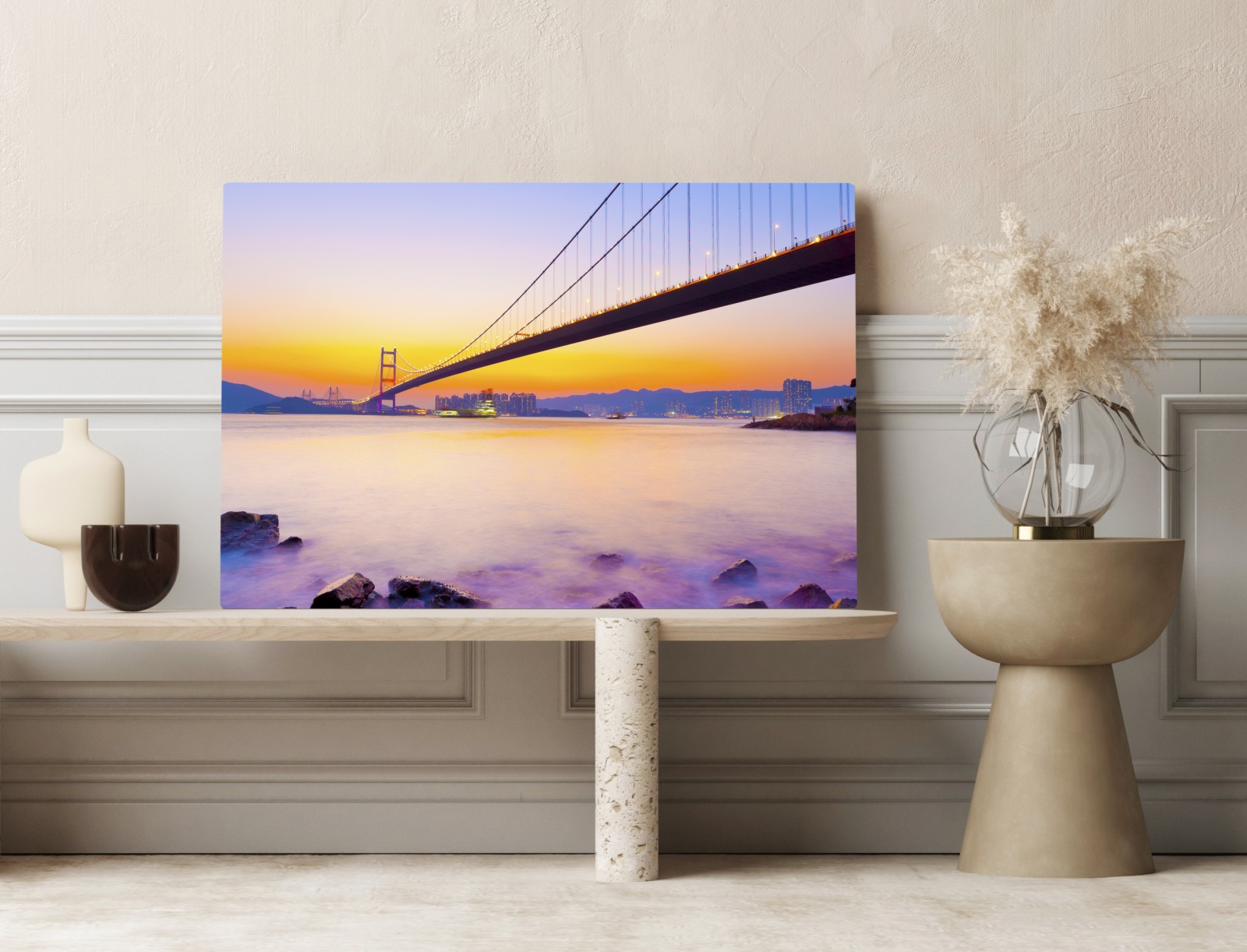 Leinwandbild Goldener sonnenuntergang über hängebrücke