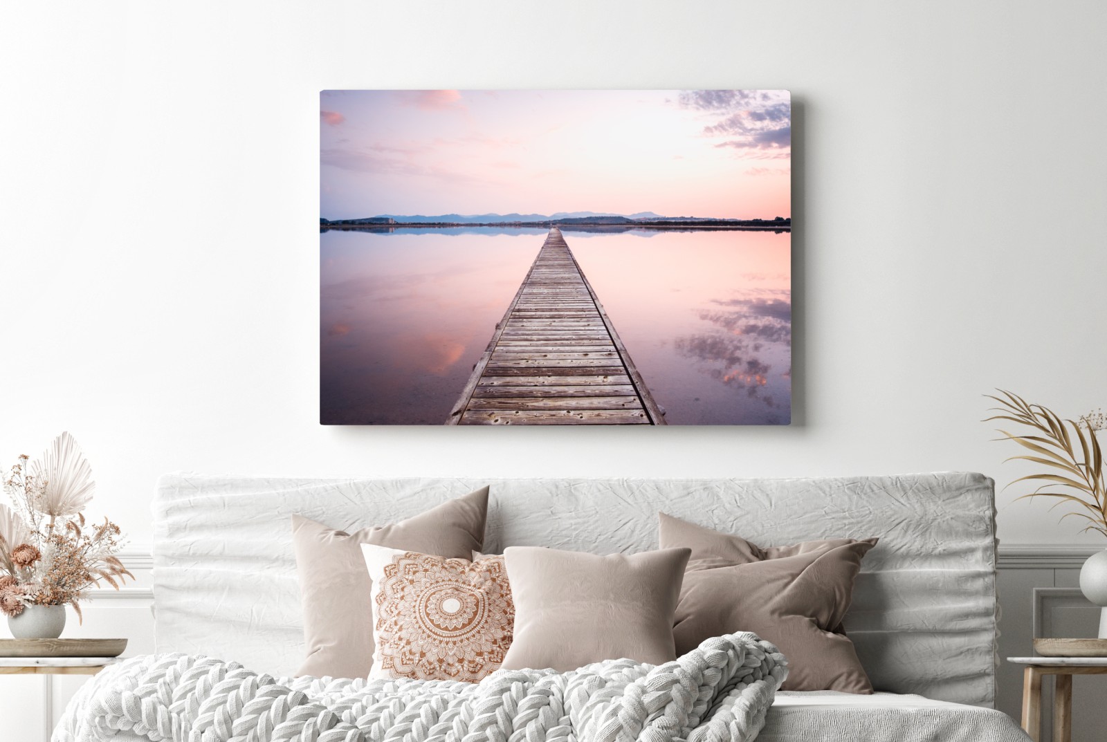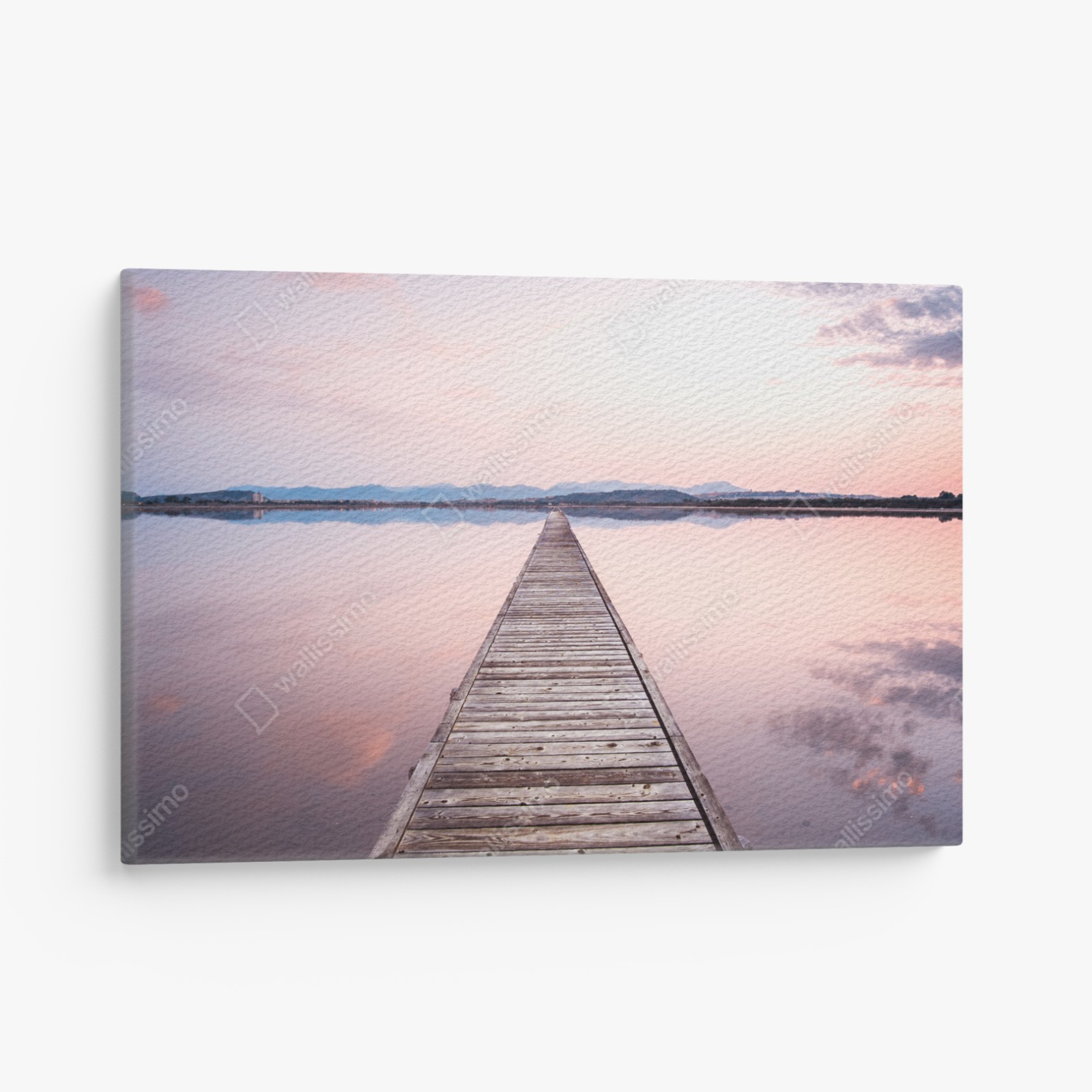 Leinwandbild Holzsteg zum horizont bei sonnenuntergang