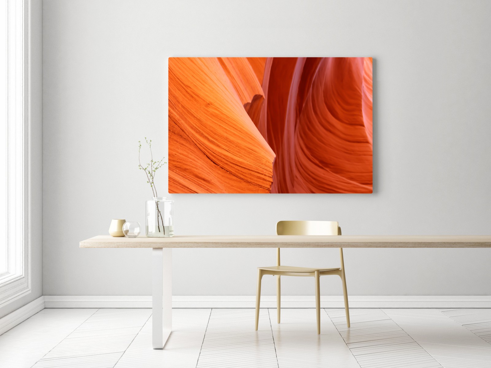 Entdecken Sie die warmen, fließenden Linien des geformten Sandsteins in diesem beeindruckenden abstrakten Landschaftsbild, ideal um jedem Raum natürliche Textur und warme Farbtöne zu verleihen.MehrWeniger
