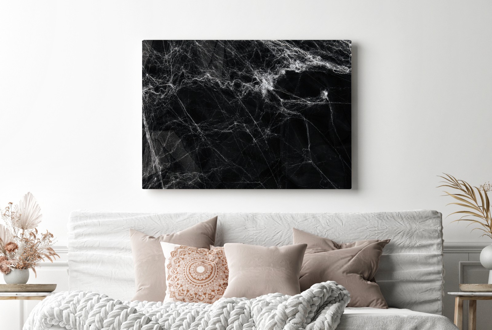 Verleihen Sie Ihrem Raum mit diesem kontrastreichen Spinnennetz auf tiefschwarzem Hintergrund eine unheimliche Atmosphäre.MehrWeniger