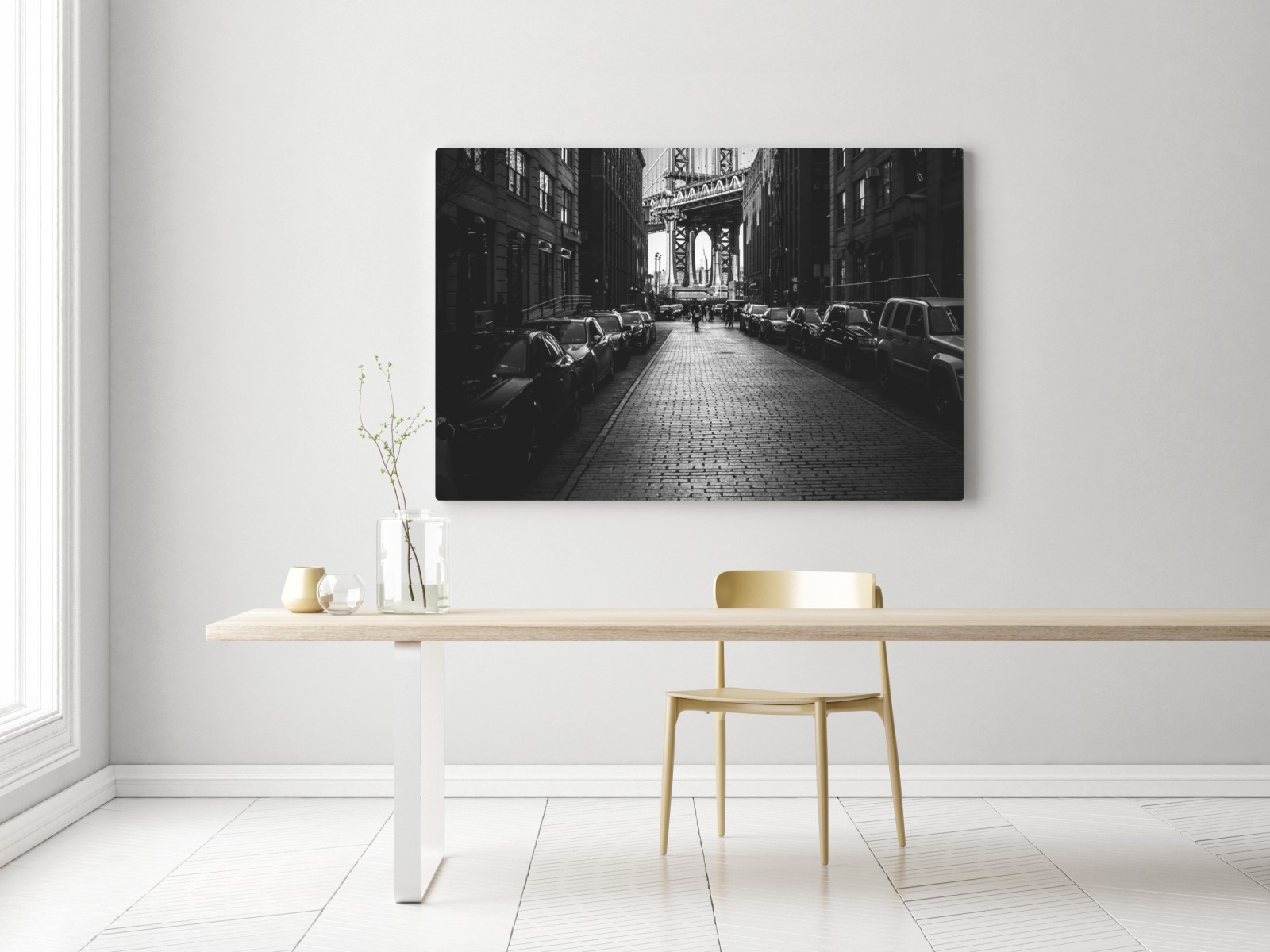 Leinwandbild Manhattan Bridge im rahmen einer gepflasterten straße