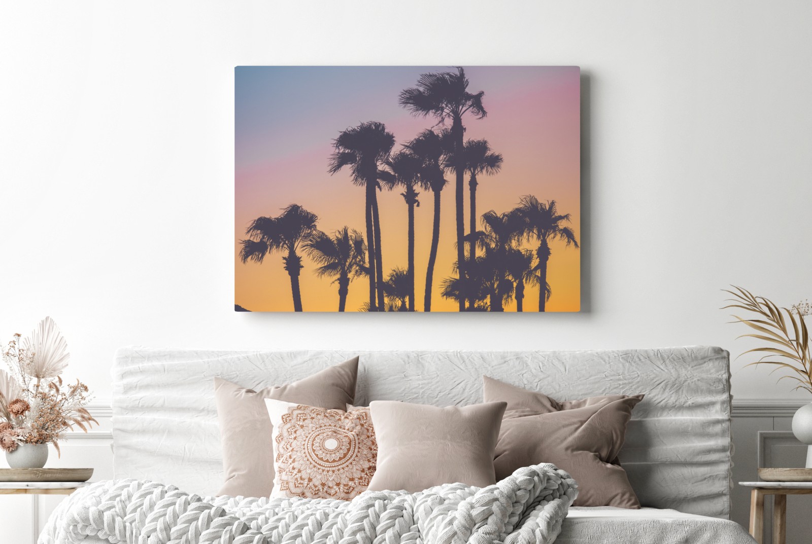 Verleihe deinem Raum eine entspannte tropische Atmosphäre mit retro-gefilterten Palmensilhouetten vor einem lebendigen Sonnenuntergang, ideal für warme Farbakzente.MehrWeniger