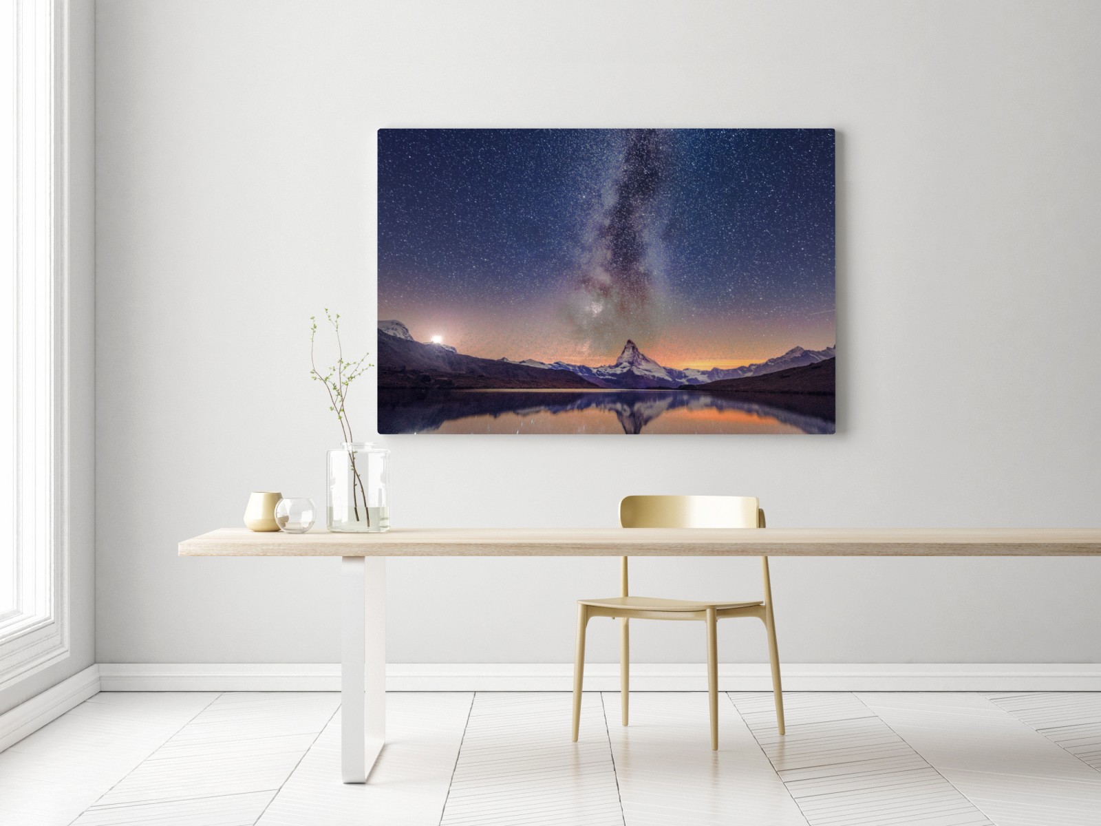 Leinwandbild Milchstraße über alpengipfel gespiegelt im see