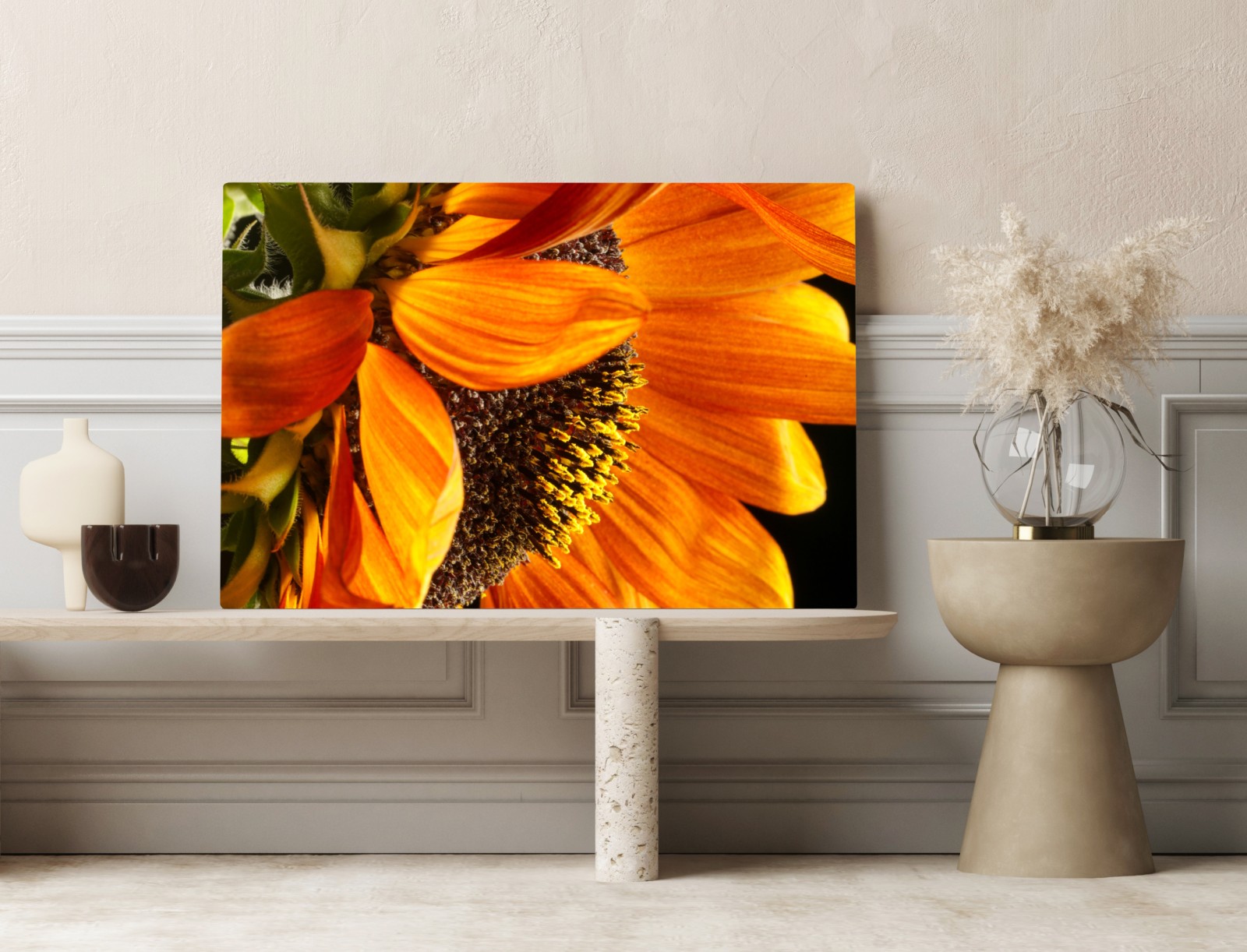 Bringen Sie Farbe in Ihr Zuhause mit einer leuchtenden Nahaufnahme einer orangefarbenen Sonnenblume, die filigrane Details und natürliche Wärme zeigt.MehrWeniger