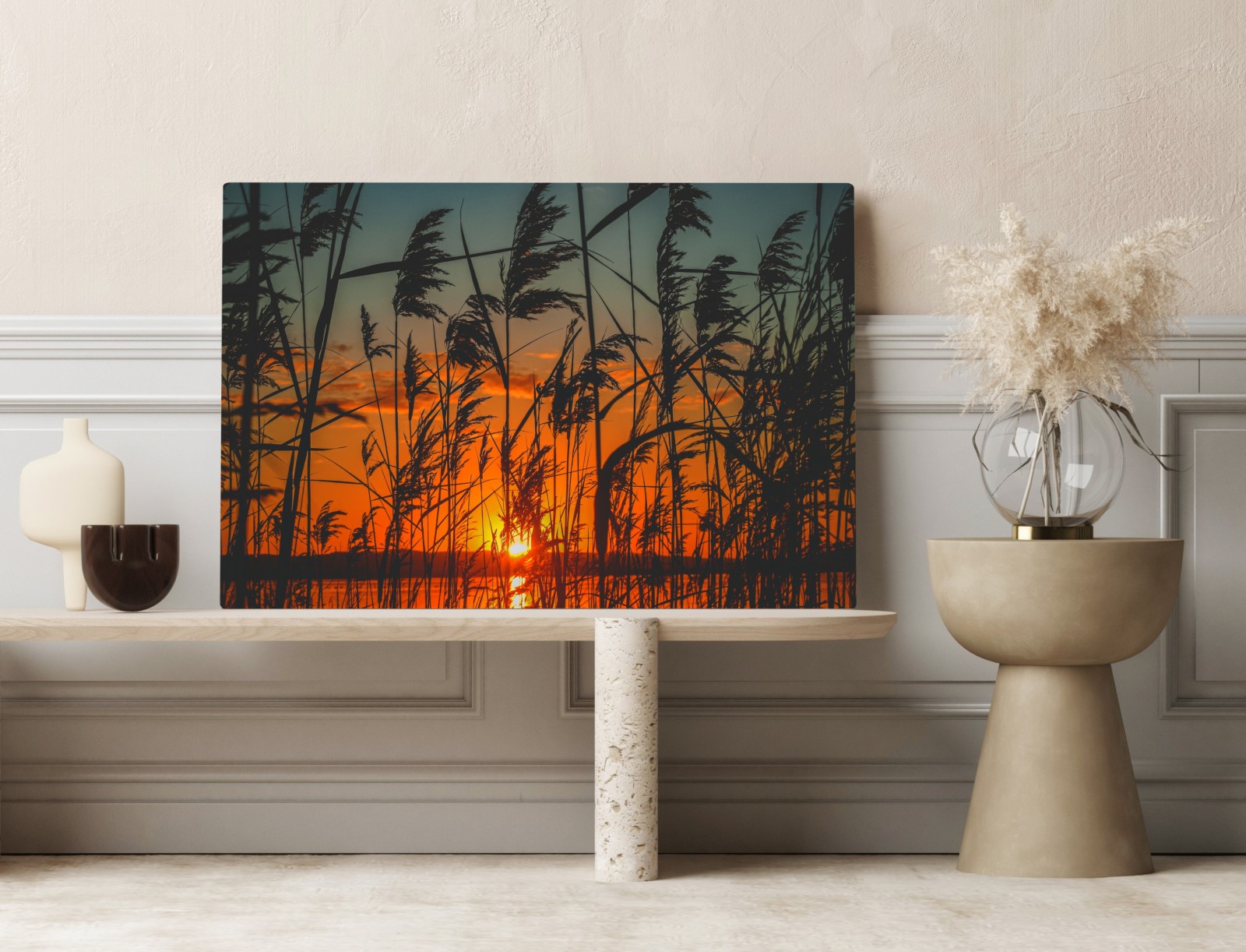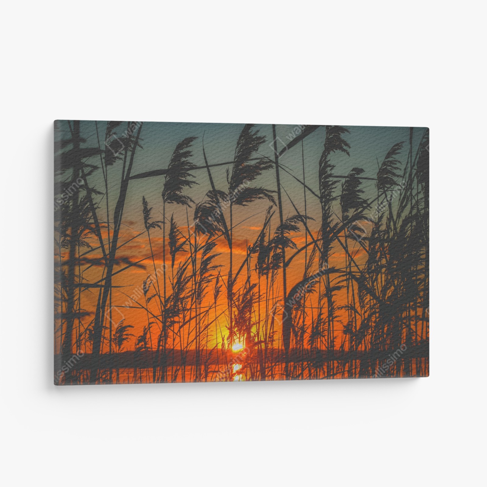 Leinwandbild Sonnenuntergang am see mit schilf-silhouette