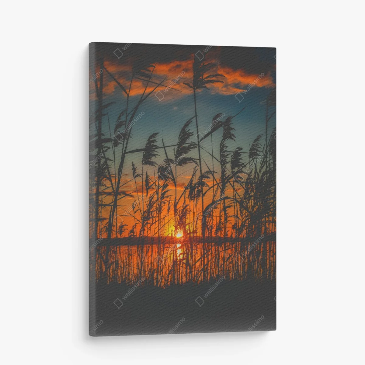 Leinwandbild Sonnenuntergang am see mit schilf-silhouette