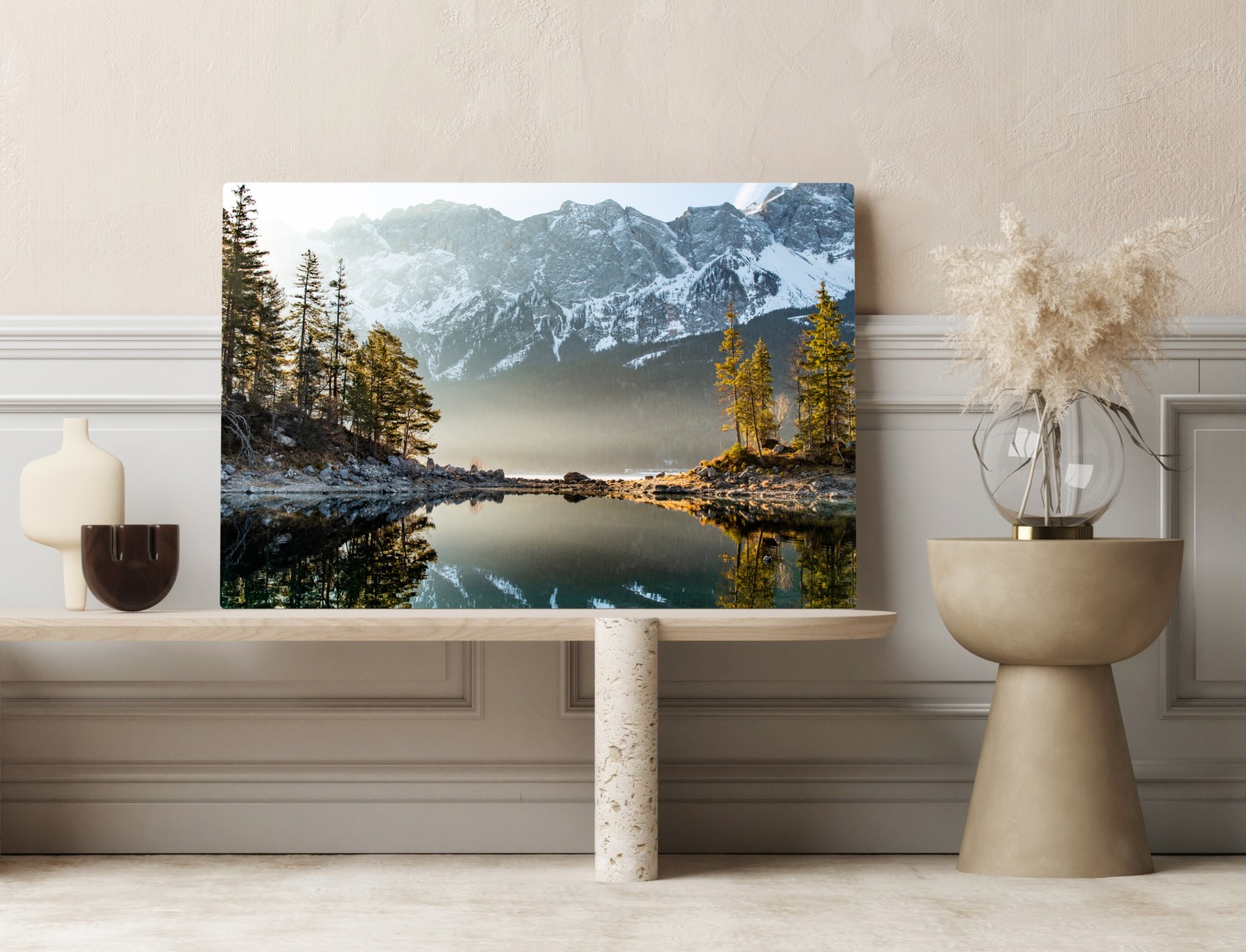 Leinwandbild Bergsee spiegelung bei sonnenaufgang