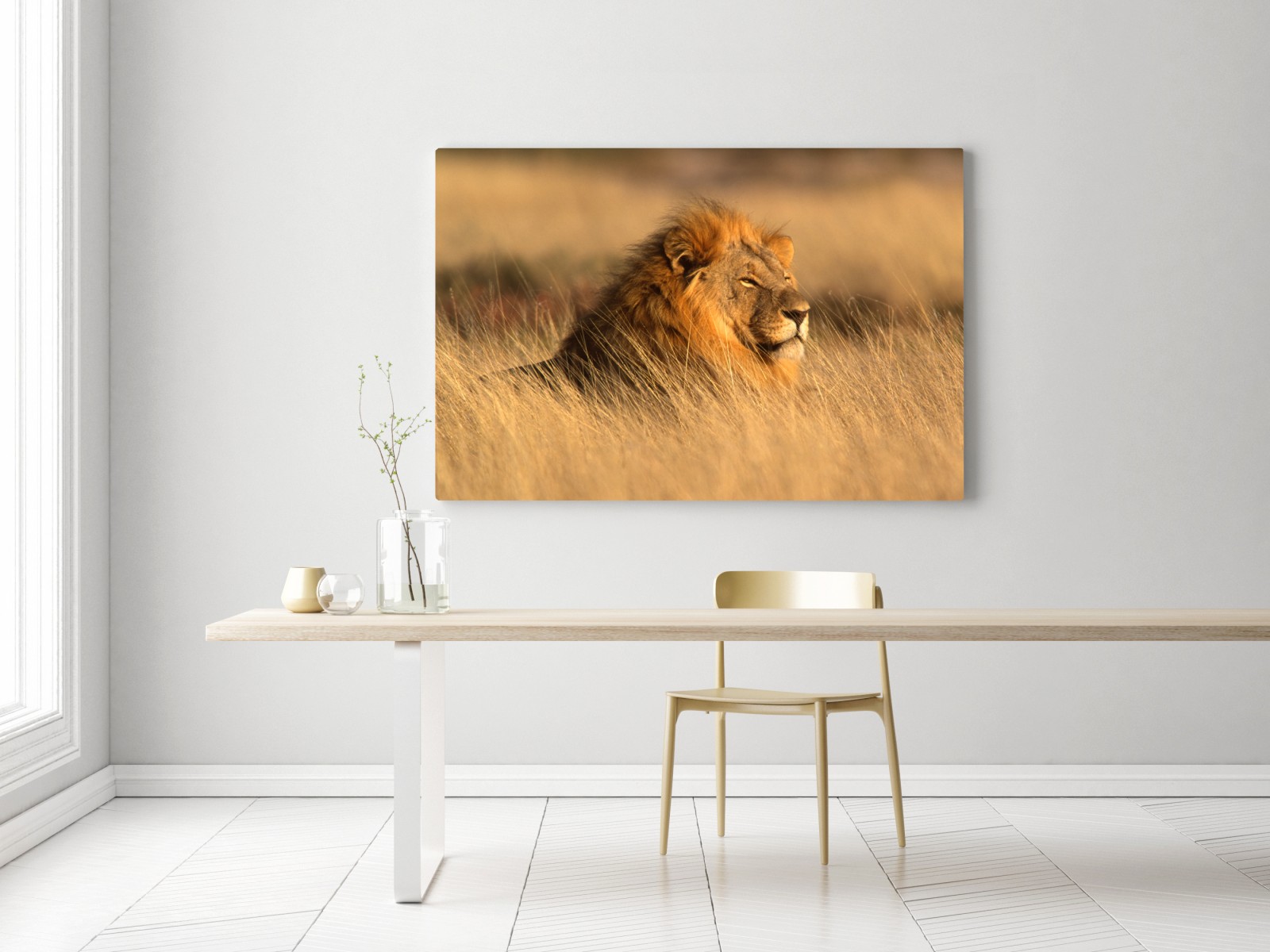 Bringen Sie die majestätische Präsenz der Savanne in Ihr Zuhause mit diesem eindrucksvollen Porträt eines Löwen, der im goldenen Gras ruht.MehrWeniger