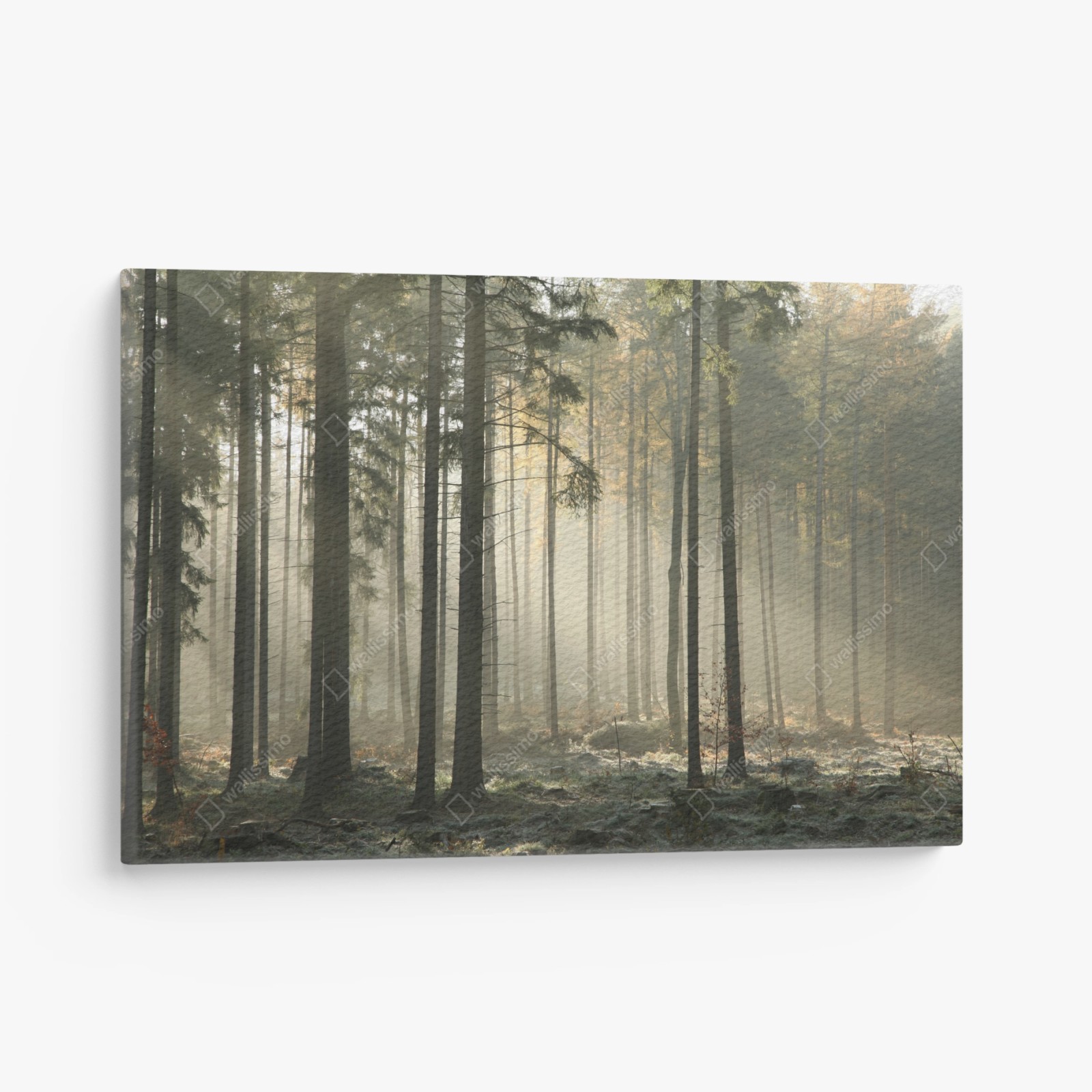 Leinwandbild Nebliger morgenwald mit sonnenstrahlen