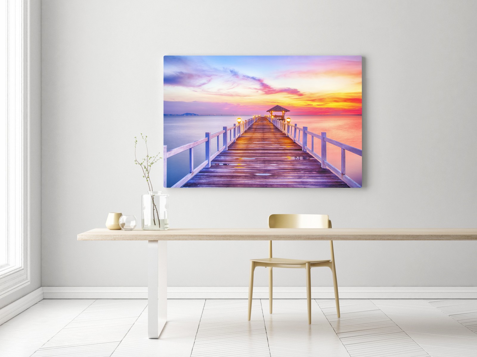 Leinwandbild Sonnenuntergang am steg zum ruhigen horizont